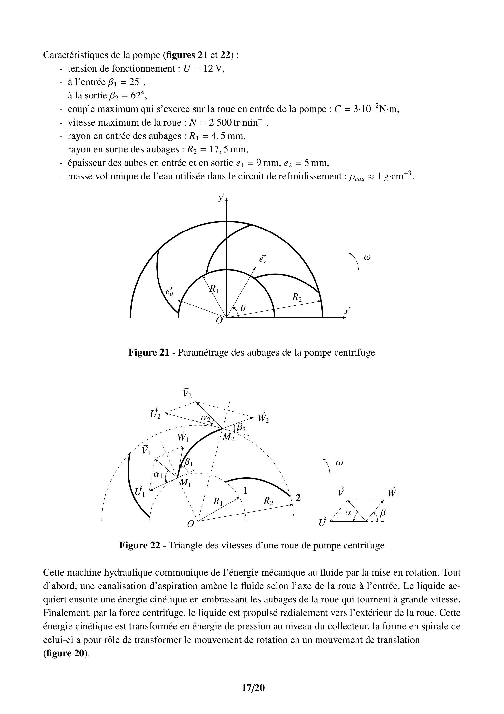 On désigne par l'épaisseur de la veine fluide en entrée et l'épaisseur de la veine fluide en sortie. varie linéairement entre et . On définit la section en entrée des aubages, la section en sortie. À l'entrée du rotor, un point est repéré par ses coordonnées et sa vitesse : , tel que .