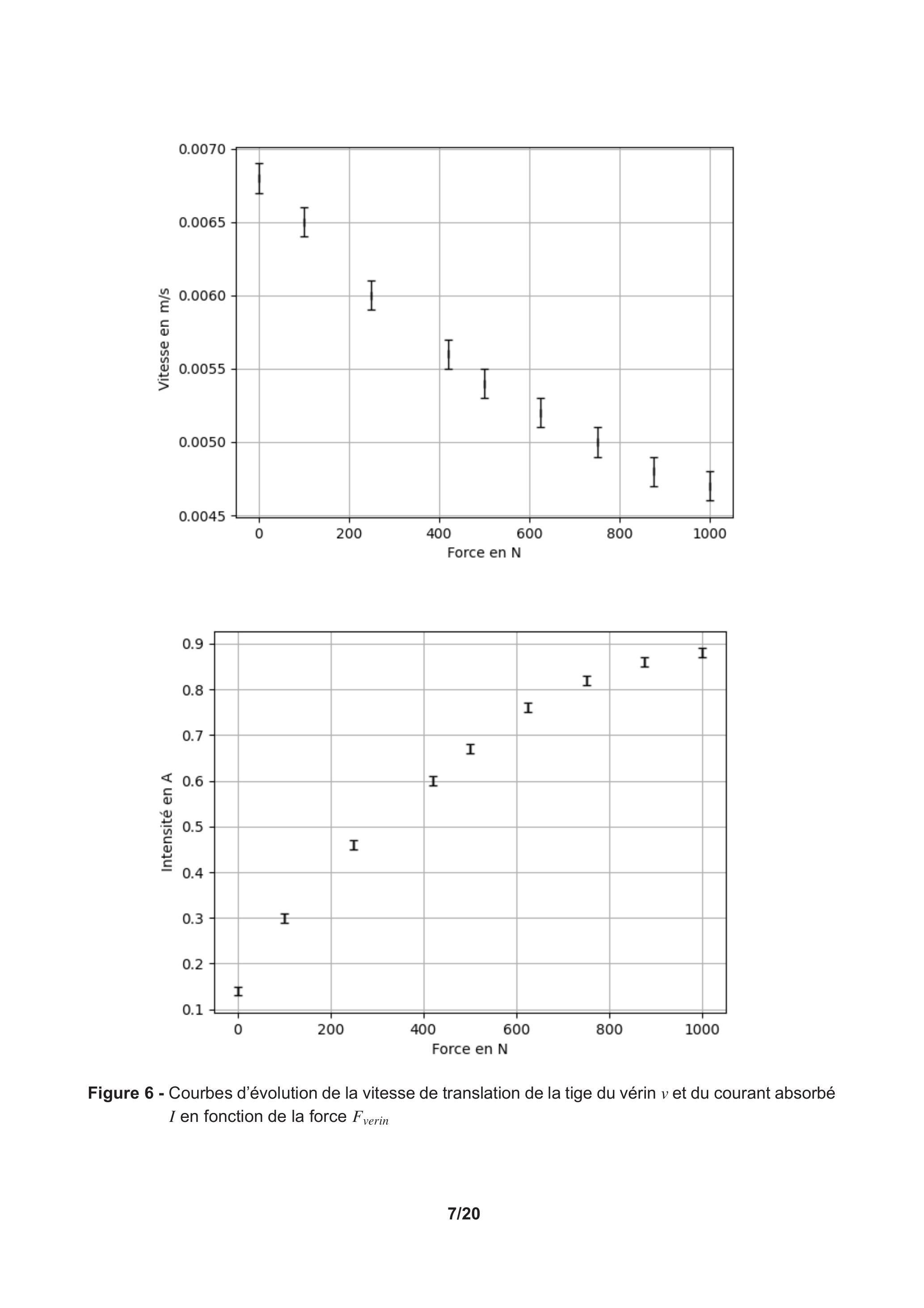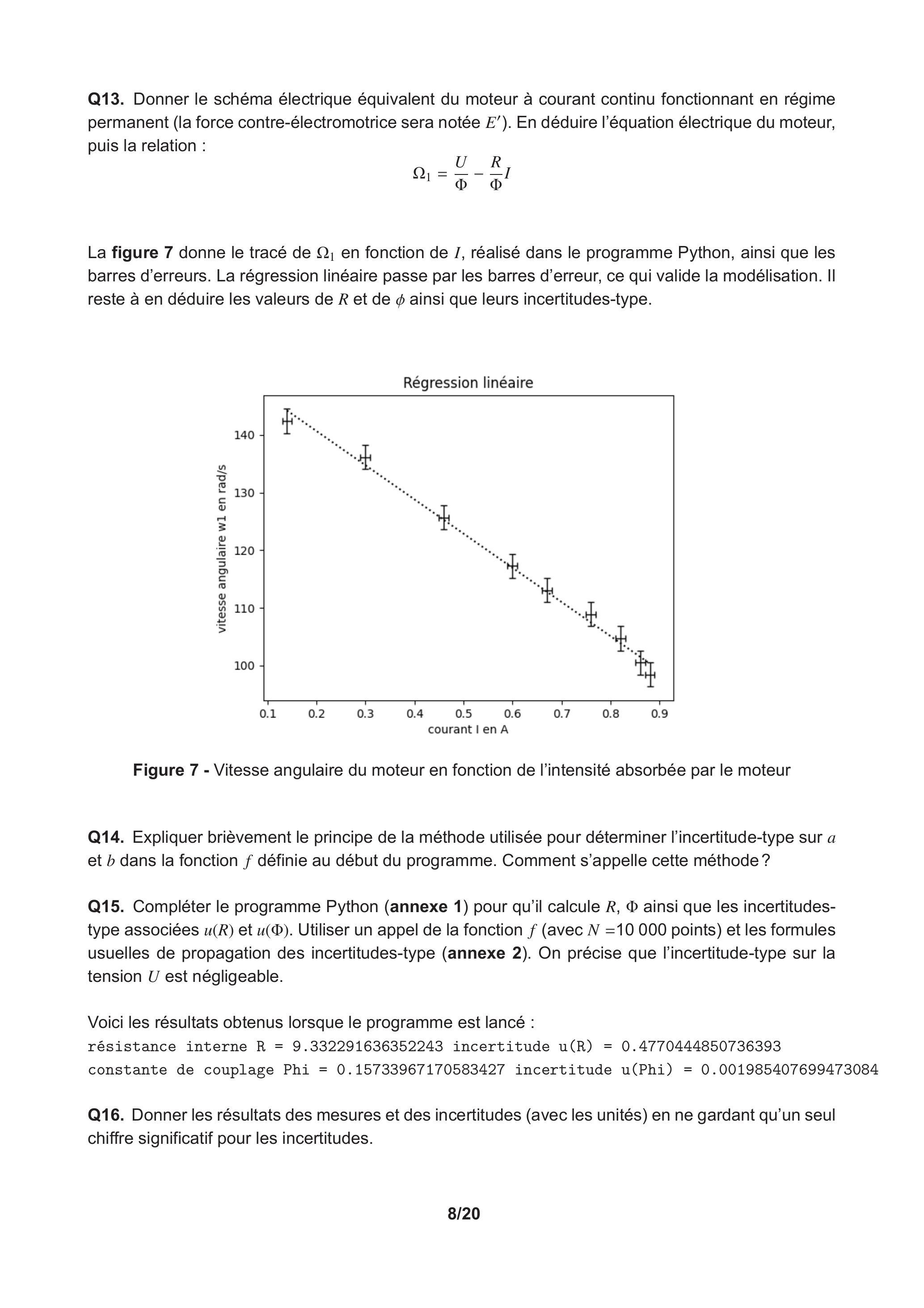 Dans le programme Python (annexe 1) figurent les valeurs expérimentales du courant et de la vitesse pour différentes valeurs de la force , ainsi que les incertitudes de mesure. Les valeurs de et de l'incertitude-type associée sont calculées par l'intermédiaire de la constante définie à la question Q12.