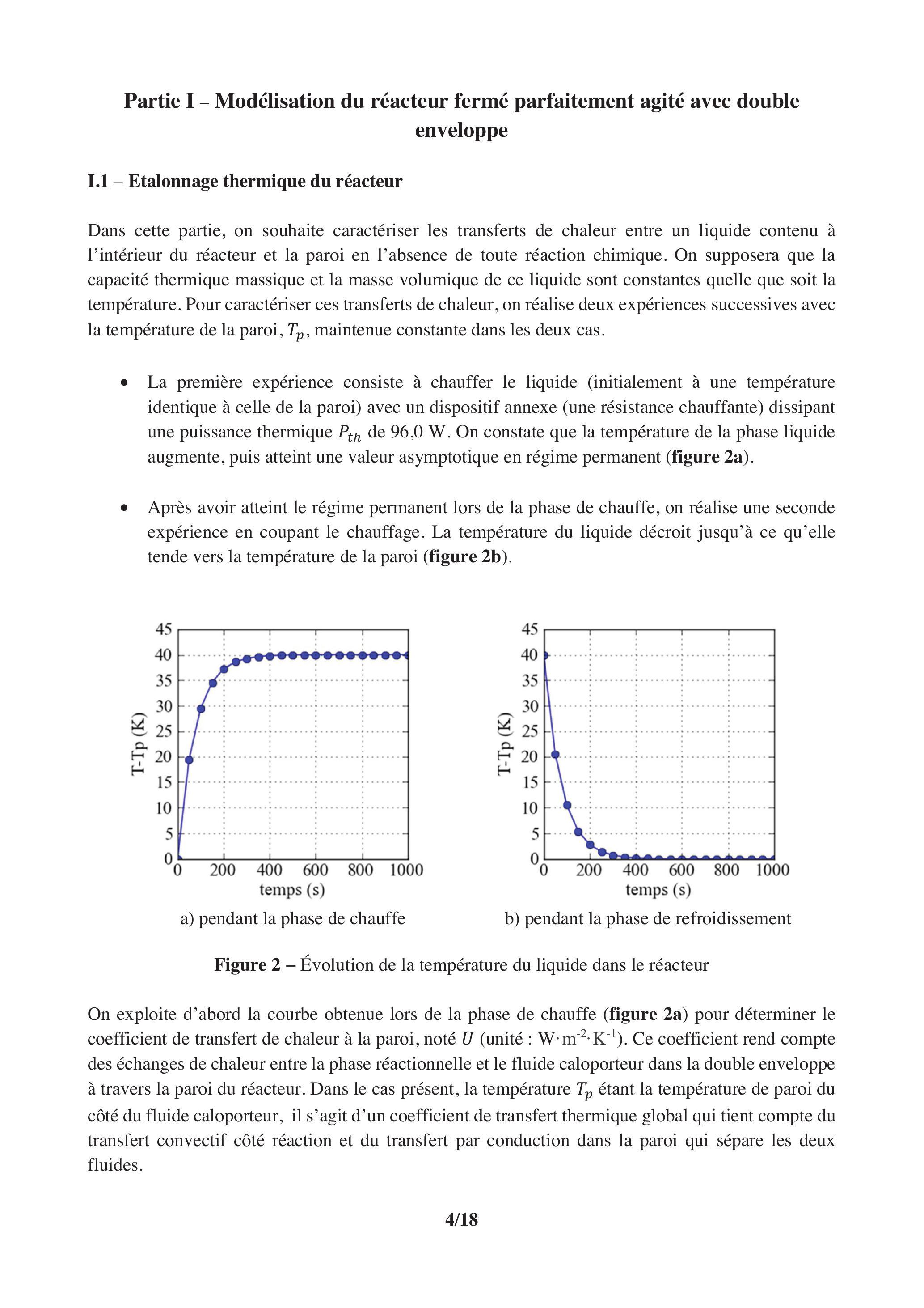 Dans cette partie, on souhaite caractériser les transferts de chaleur entre un liquide contenu à l'intérieur du réacteur et la paroi en l'absence de toute réaction chimique. On supposera que la capacité thermique massique et la masse volumique de ce liquide sont constantes quelle que soit la température. Pour caractériser ces transferts de chaleur, on réalise deux expériences successives avec la température de la paroi, , maintenue constante dans les deux cas.