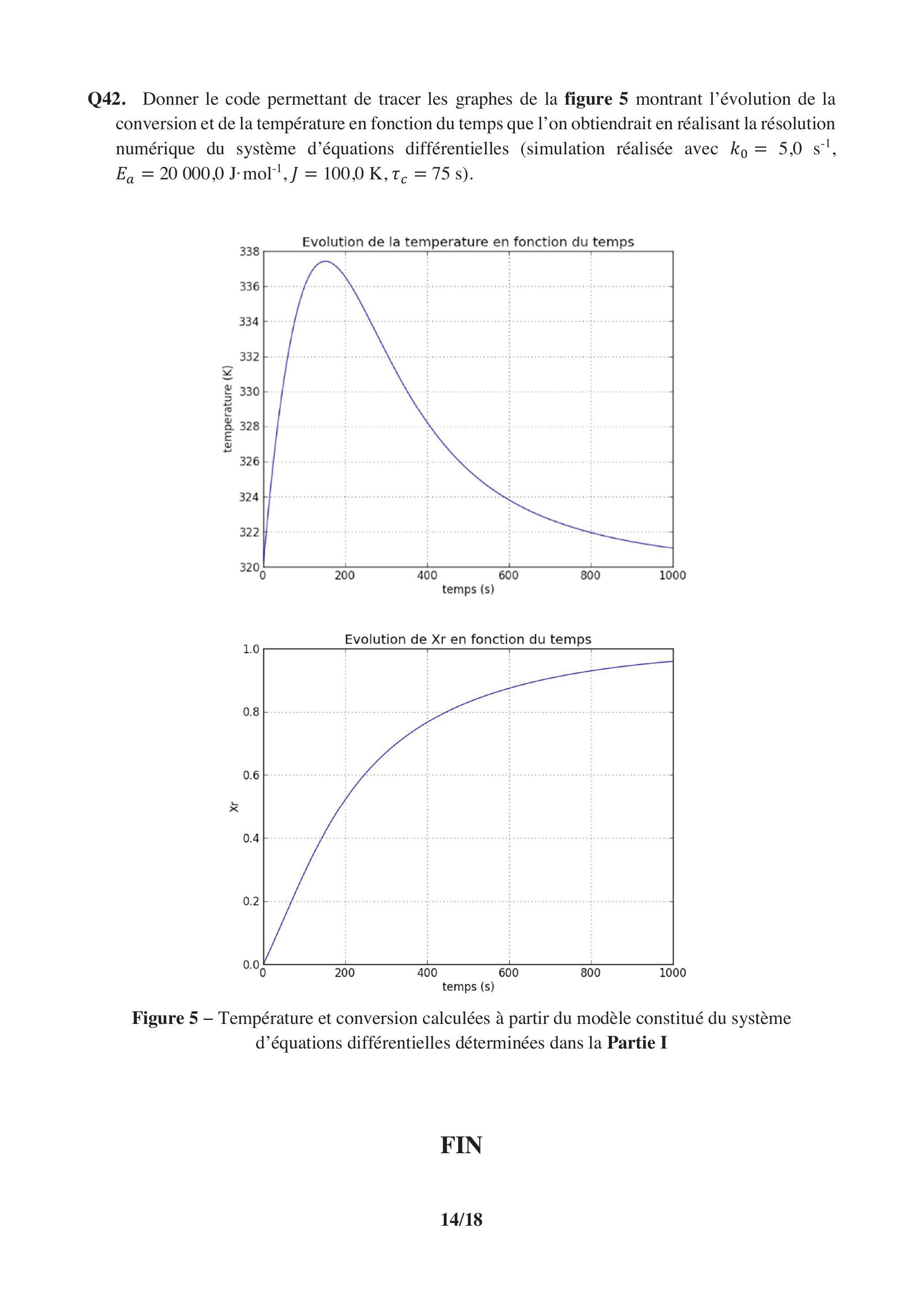 Q42. Donner le code permettant de tracer les graphes de la figure 5 montrant l'évolution de la conversion et de la température en fonction du temps que l'on obtiendrait en réalisant la résolution numérique du système d'équations différentielles (simulation réalisée avec , .