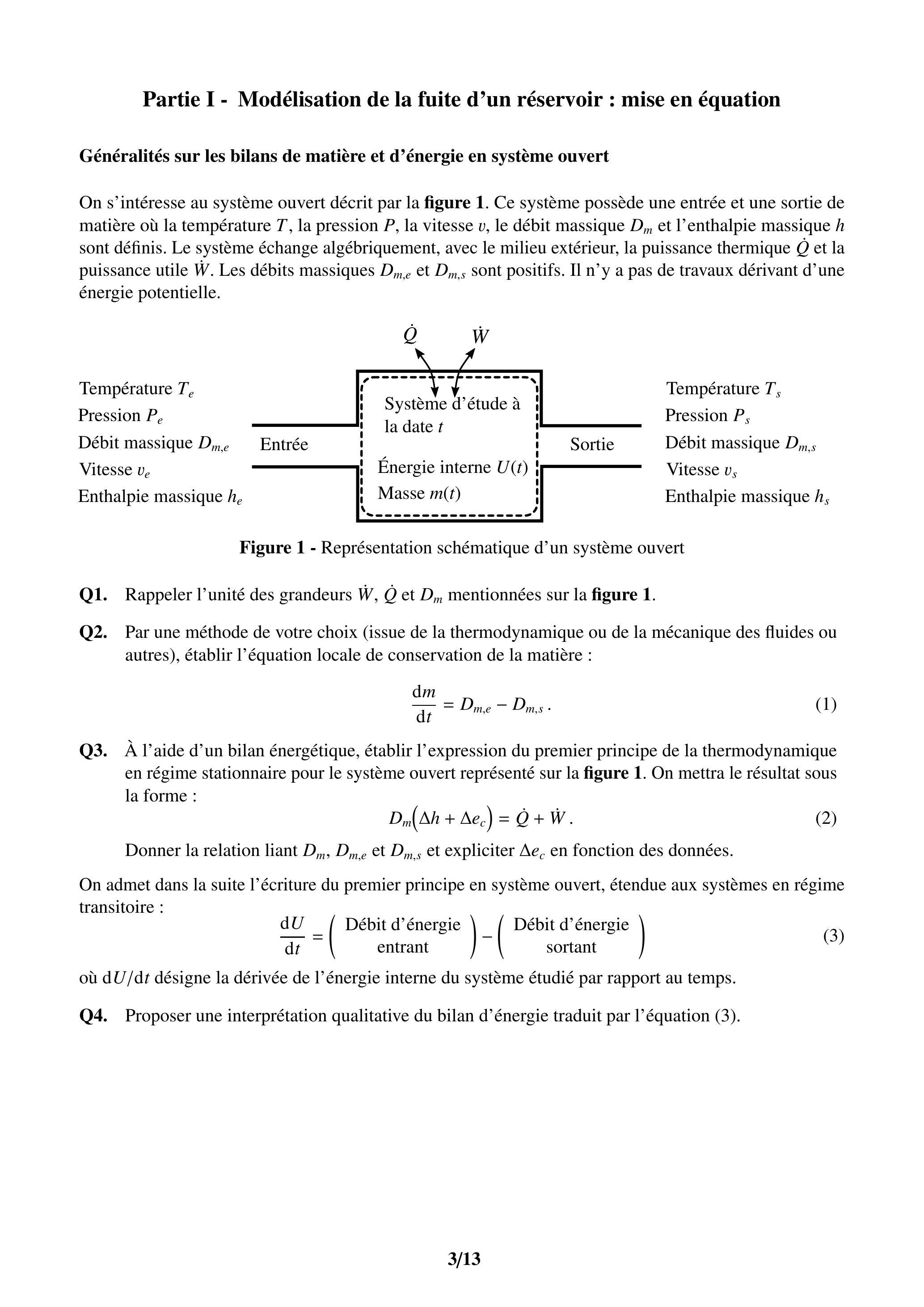 Q5. On suppose que les grandeurs intensives du gaz dans le réservoir sont uniformes et que celles du gaz sortant sont identiques à celles du réservoir. On suppose négligeable l'énergie cinétique massique de la matière quittant le système. On s'intéresse au système {volume contenant le gaz à et dans le réservoir, paroi non comprise} représenté par des pointillés sur la figure 2. Justifier que l'application du bilan de matière et du premier principe (équations (1) et (3)) au système en pointillés, décrit par la figure 2, permet d'obtenir le système d'équations :