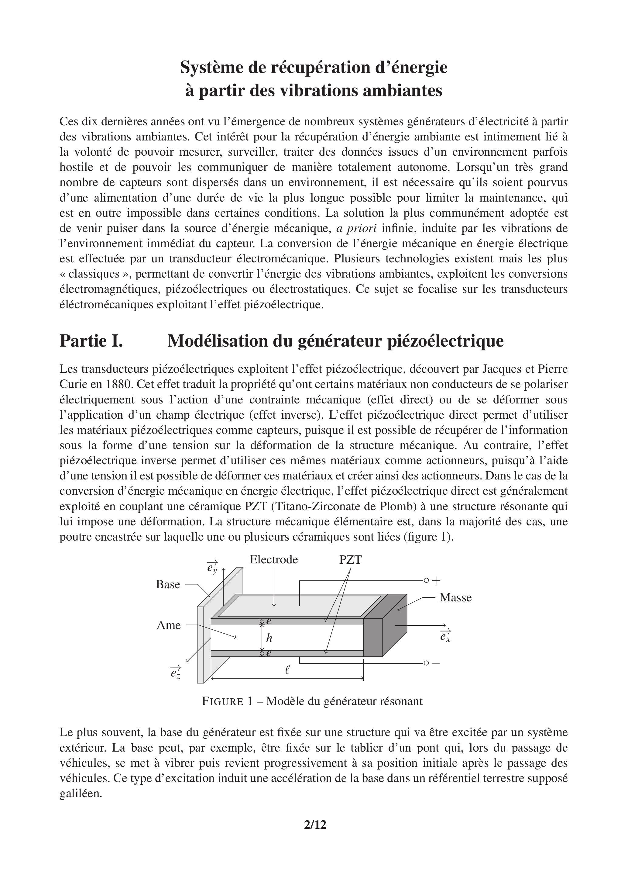 Ces dix dernières années ont vu l'émergence de nombreux systèmes générateurs d'électricité à partir des vibrations ambiantes. Cet intérêt pour la récupération d'énergie ambiante est intimement lié à la volonté de pouvoir mesurer, surveiller, traiter des données issues d'un environnement parfois hostile et de pouvoir les communiquer de manière totalement autonome. Lorsqu'un très grand nombre de capteurs sont dispersés dans un environnement, il est nécessaire qu'ils soient pourvus d'une alimentation d'une durée de vie la plus longue possible pour limiter la maintenance, qui est en outre impossible dans certaines conditions. La solution la plus communément adoptée est de venir puiser dans la source d'énergie mécanique, a priori infinie, induite par les vibrations de l'environnement immédiat du capteur. La conversion de l'énergie mécanique en énergie électrique est effectuée par un transducteur électromécanique. Plusieurs technologies existent mais les plus «classiques», permettant de convertir l'énergie des vibrations ambiantes, exploitent les conversions électromagnétiques, piézoélectriques ou électrostatiques. Ce sujet se focalise sur les transducteurs éléctromécaniques exploitant l'effet piézoélectrique.