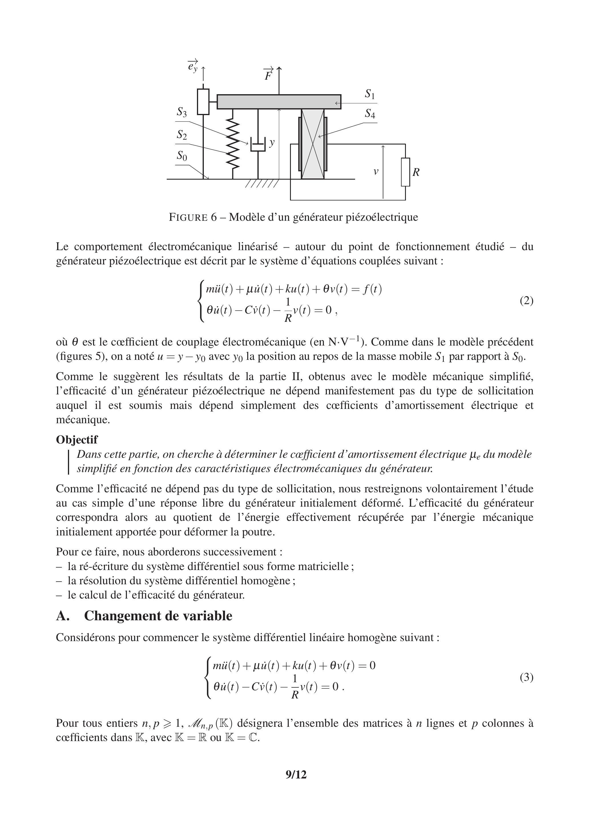 Le comportement électromécanique linéarisé - autour du point de fonctionnement étudié - du générateur piézoélectrique est décrit par le système d'équations couplées suivant :