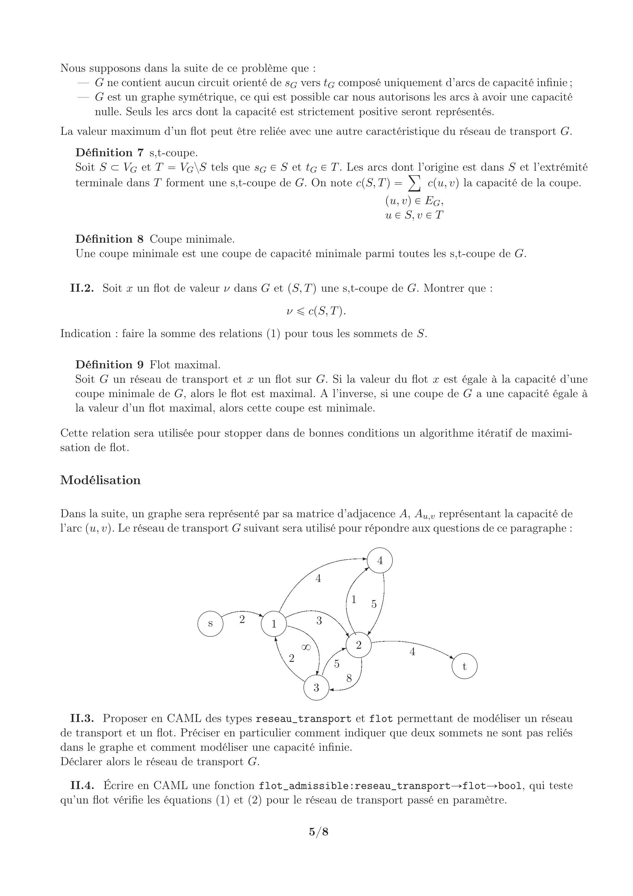 II.4. Écrire en CAML une fonction flot_admissible:reseau_transport bool, qui teste qu'un flot vérifie les équations (1) et (2) pour le réseau de transport passé en paramètre.