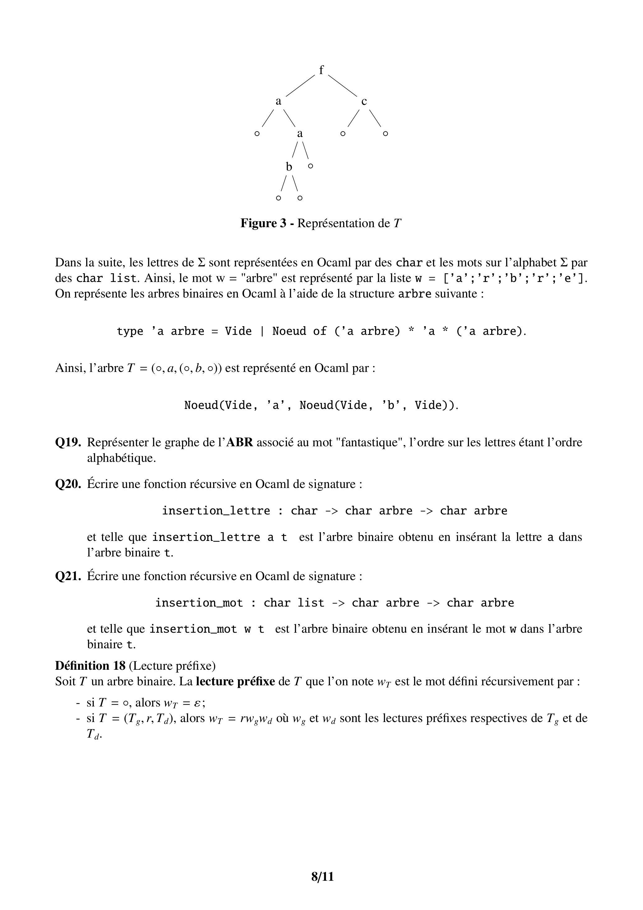 Dans la suite, les lettres de sont représentées en Ocaml par des char et les mots sur l'alphabet par des char list. Ainsi, le mot "arbre" est représenté par la liste ' a ' ' r ' ; ' b ' ; ' r ' ; ' e ' . On représente les arbres binaires en Ocaml à l'aide de la structure arbre suivante :