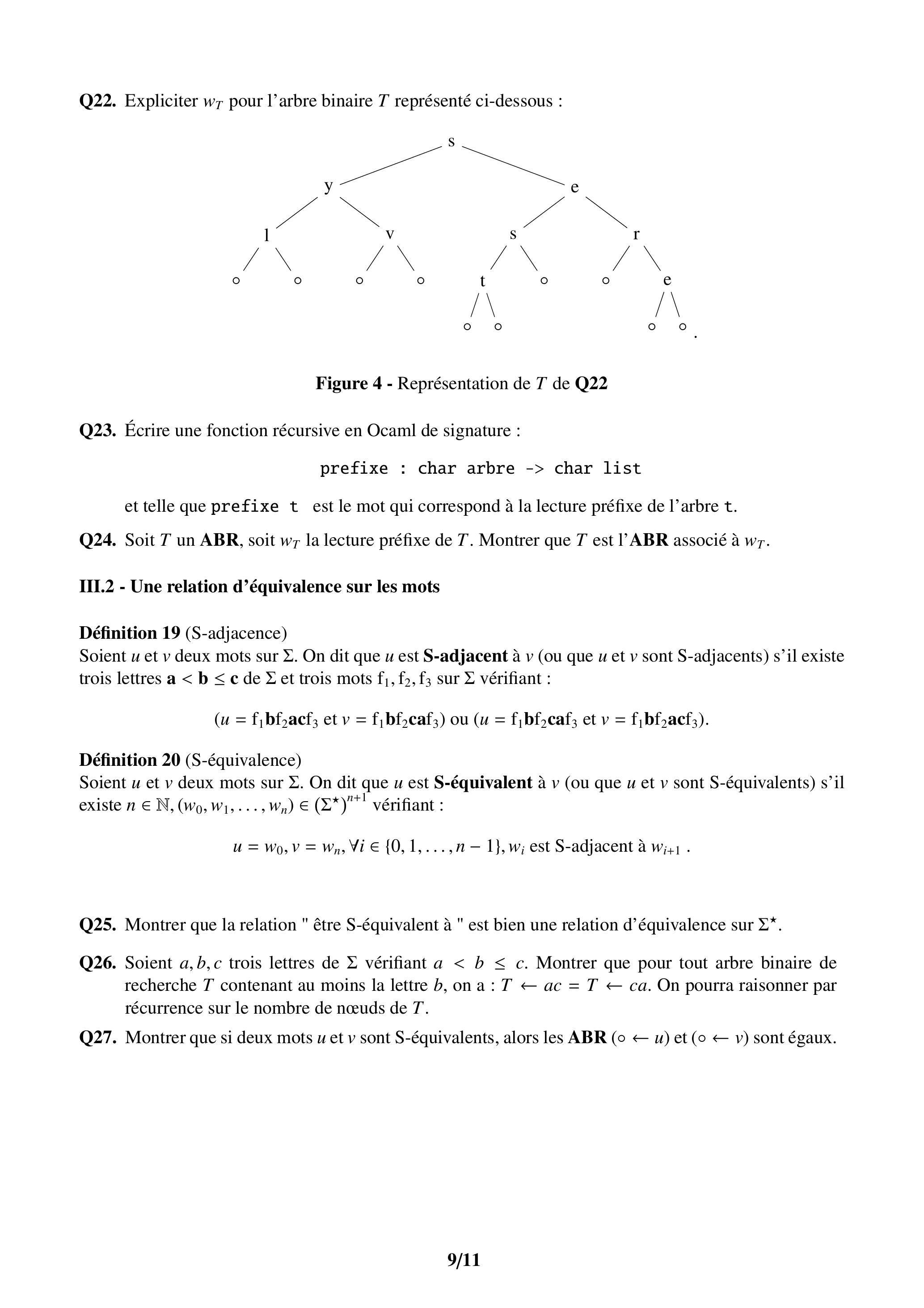 Q29. Montrer que tout mot est S-équivalent à , où est la lecture préfixe de . On pourra raisonner par récurrence sur la longueur du mot et exploiter les résultats de la .