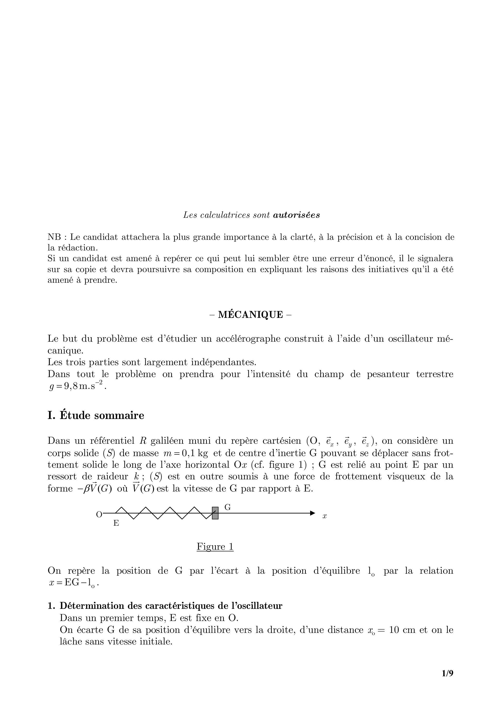 Le but du problème est d'étudier un accélérographe construit à l'aide d'un oscillateur mécanique.