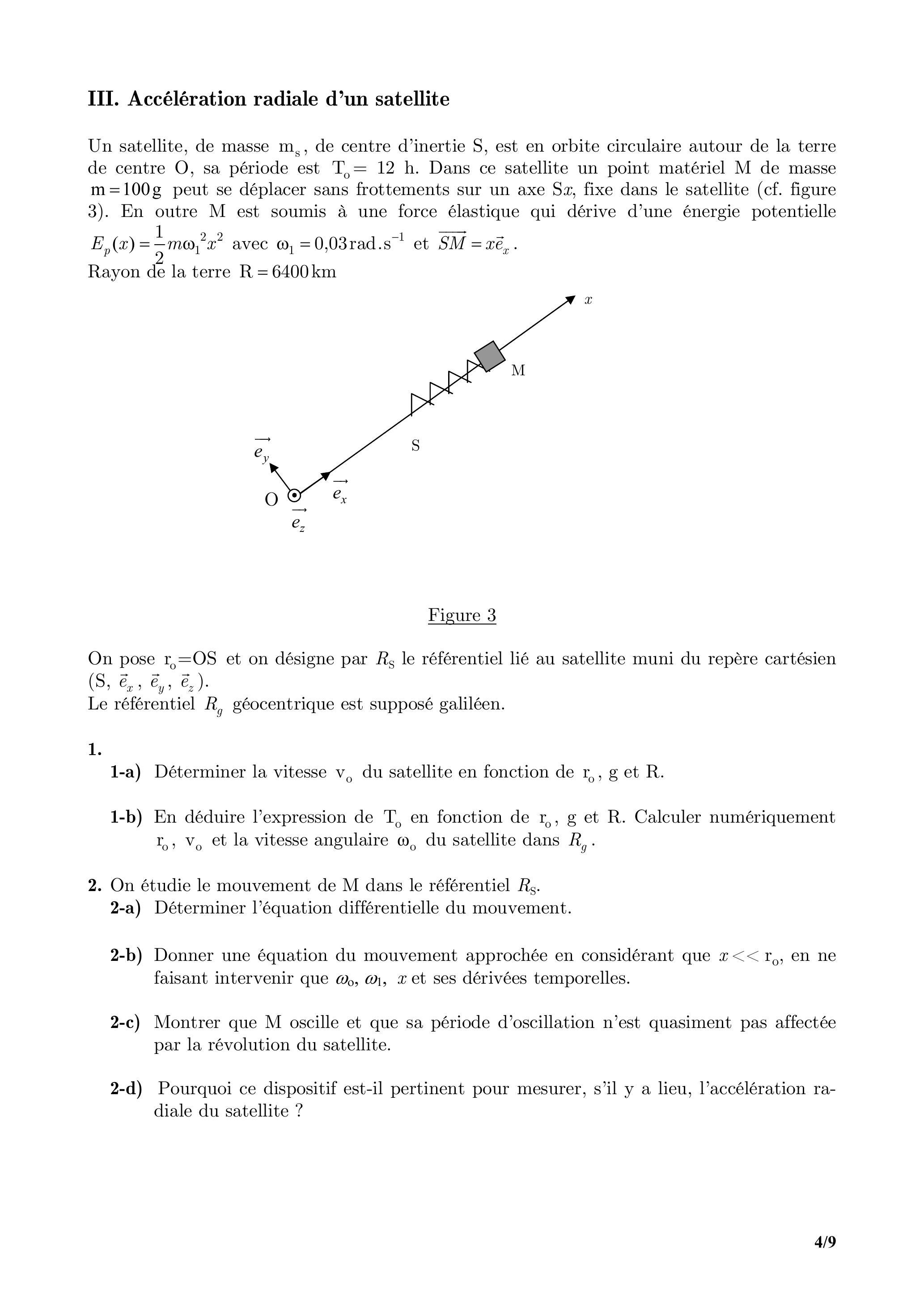 Un satellite, de masse , de centre d'inertie S , est en orbite circulaire autour de la terre de centre O , sa période est . Dans ce satellite un point matériel M de masse peut se déplacer sans frottements sur un axe , fixe dans le satellite (cf. figure 3 ). En outre M est soumis à une force élastique qui dérive d'une énergie potentielle avec et .