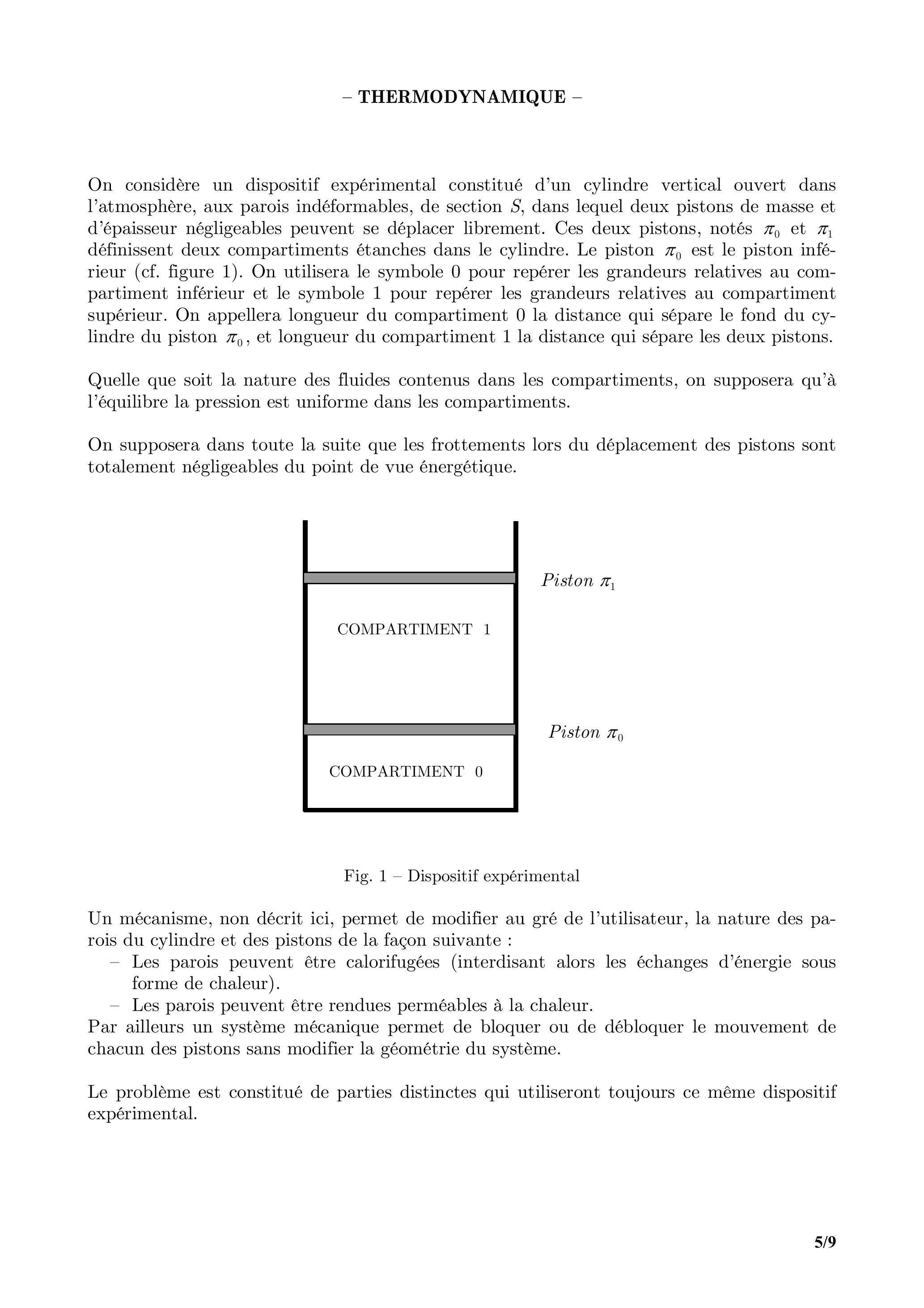 On considère un dispositif expérimental constitué d'un cylindre vertical ouvert dans l'atmosphère, aux parois indéformables, de section , dans lequel deux pistons de masse et d'épaisseur négligeables peuvent se déplacer librement. Ces deux pistons, notés et définissent deux compartiments étanches dans le cylindre. Le piston est le piston inférieur (cf. figure 1). On utilisera le symbole 0 pour repérer les grandeurs relatives au compartiment inférieur et le symbole 1 pour repérer les grandeurs relatives au compartiment supérieur. On appellera longueur du compartiment 0 la distance qui sépare le fond du cylindre du piston , et longueur du compartiment 1 la distance qui sépare les deux pistons.