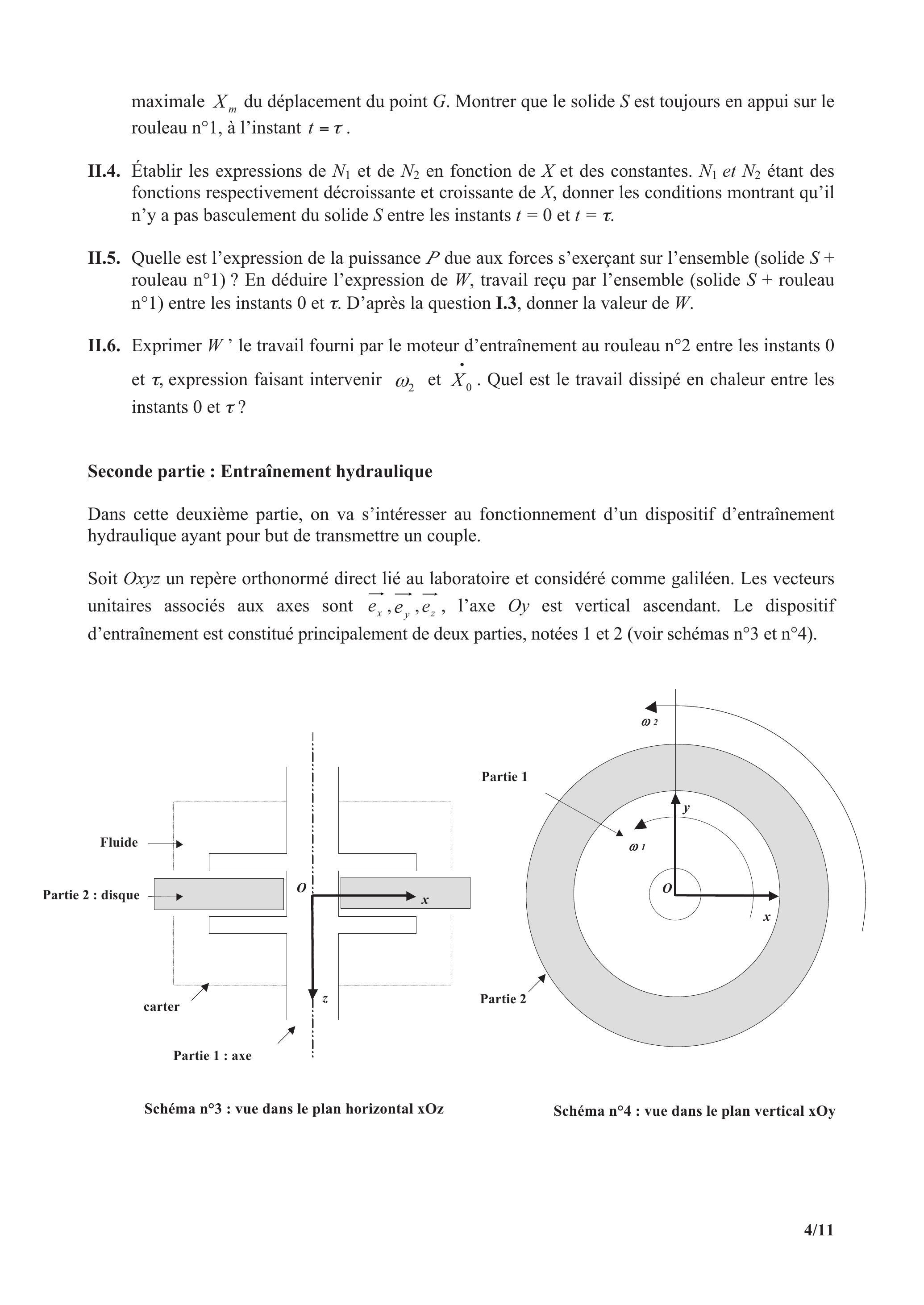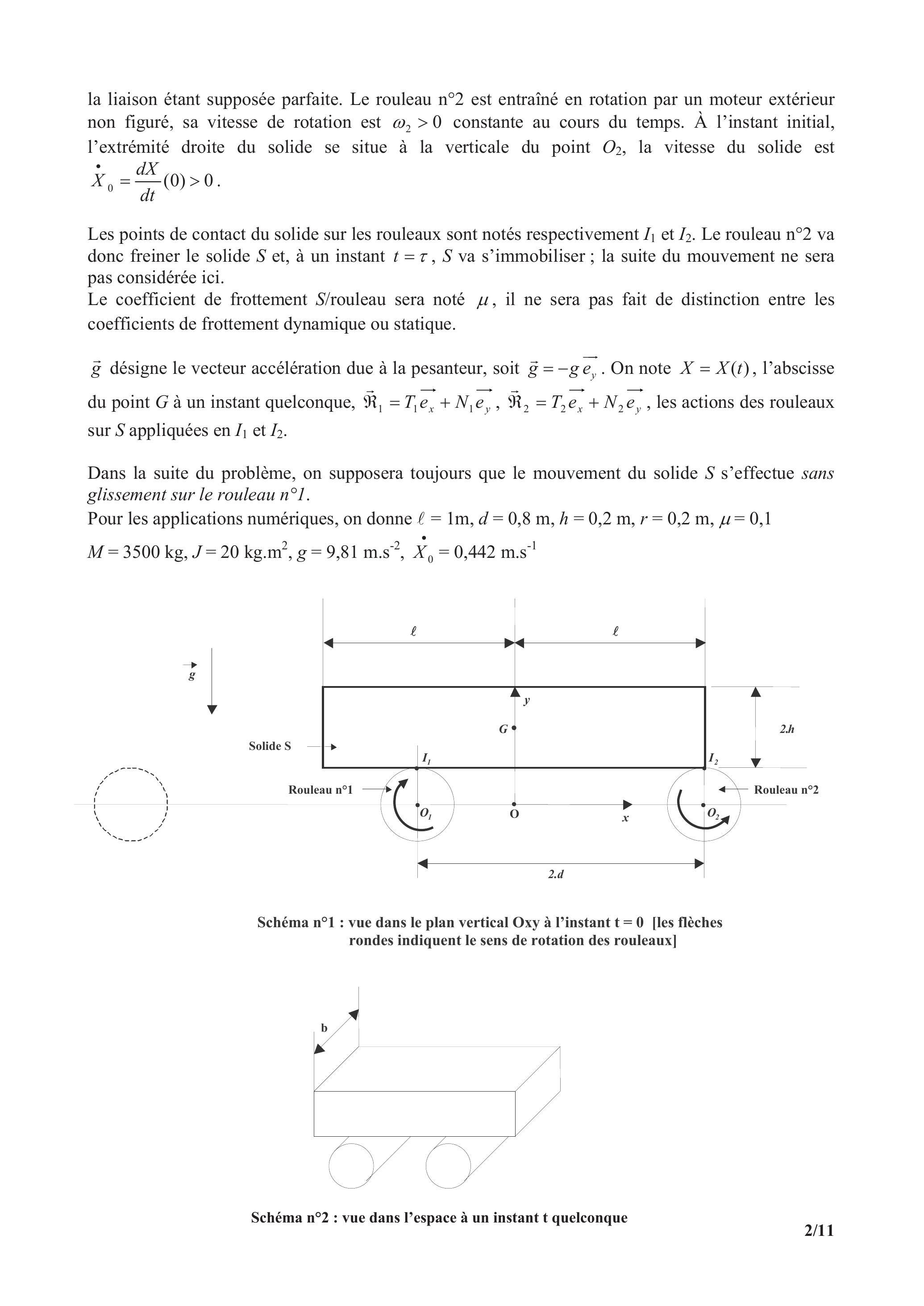 L'épreuve porte sur l'étude de deux systèmes particuliers. Le premier système étudie le mouvement plan d'un ensemble composé d'un solide en translation et de deux autres solides en rotation autour d'axes fixes, il aura glissement pour l'un des contacts et non-glissement pour l'autre. La seconde partie va s'intéresser au mouvement de deux solides en rotation autour d'un axe commun; il est à noter que cette seconde partie est indépendante de la première.