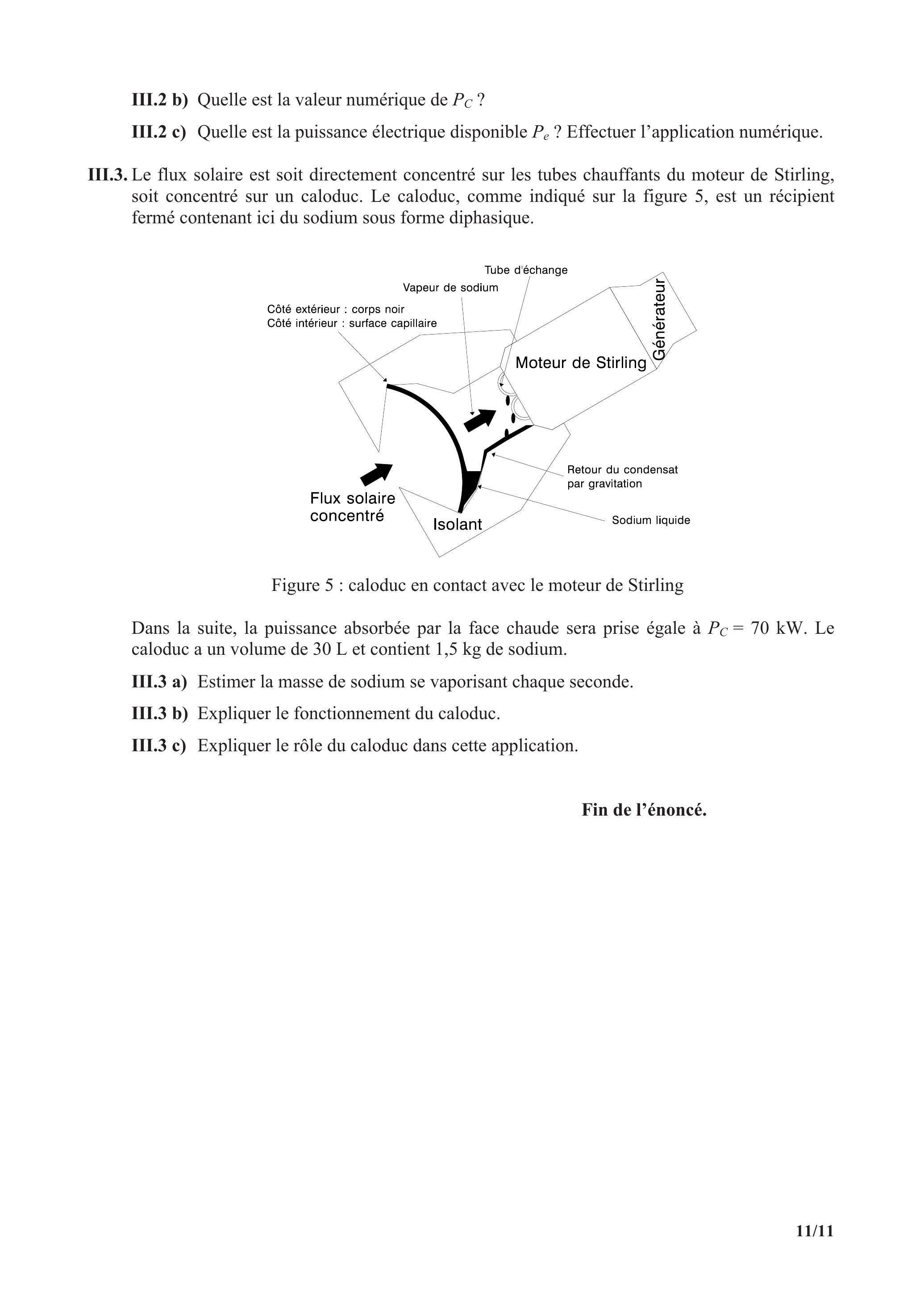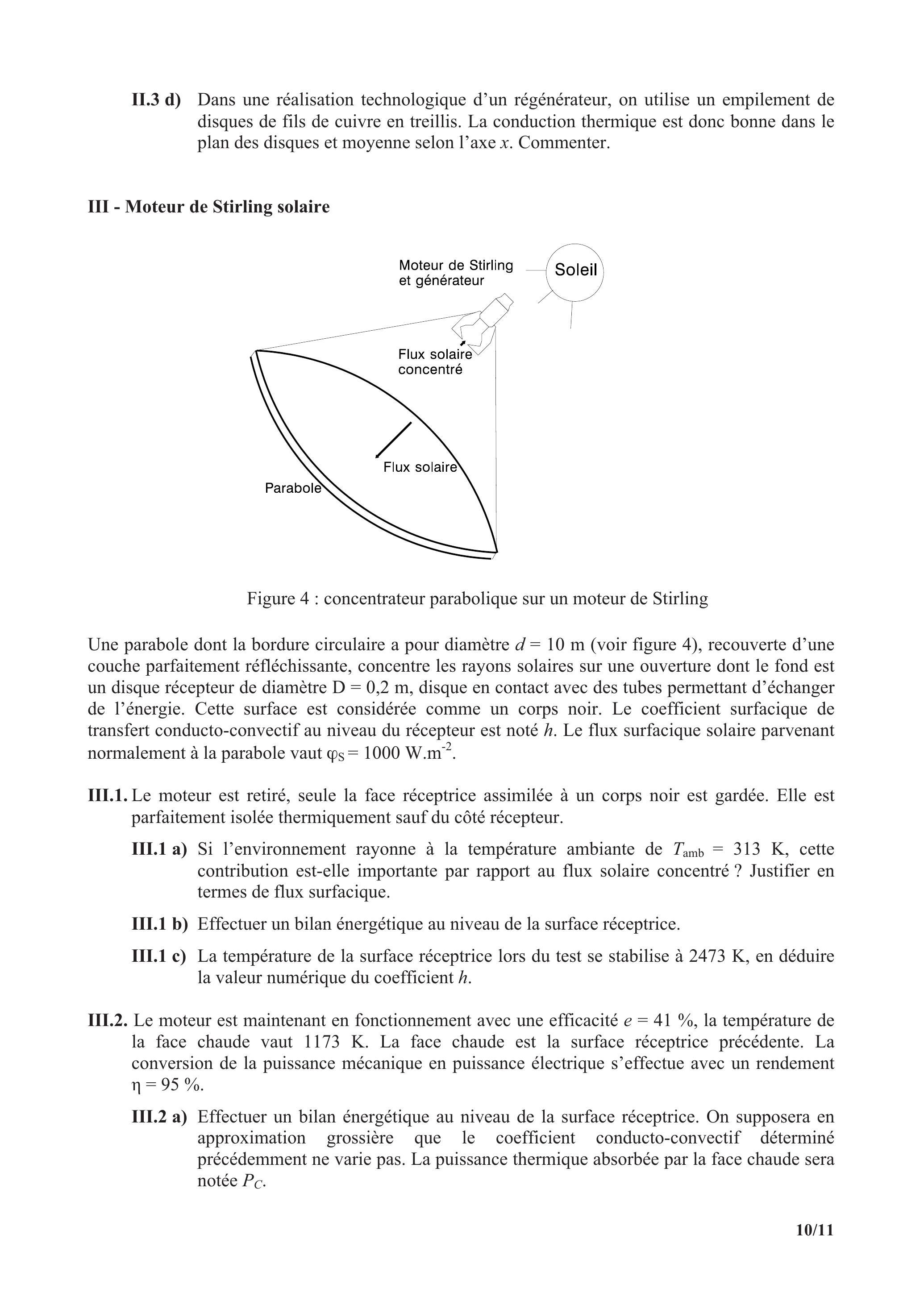 Ce problème comporte 3 parties. La première partie permet de comprendre l'intérêt du régénérateur dans le calcul de l'efficacité. La seconde partie analyse le rôle du volume et des pertes thermiques dans un régénérateur réel. La dernière partie, indépendante des deux précédentes, aborde la concentration du flux solaire et le transfert thermique à la chambre chaude du moteur de Stirling.