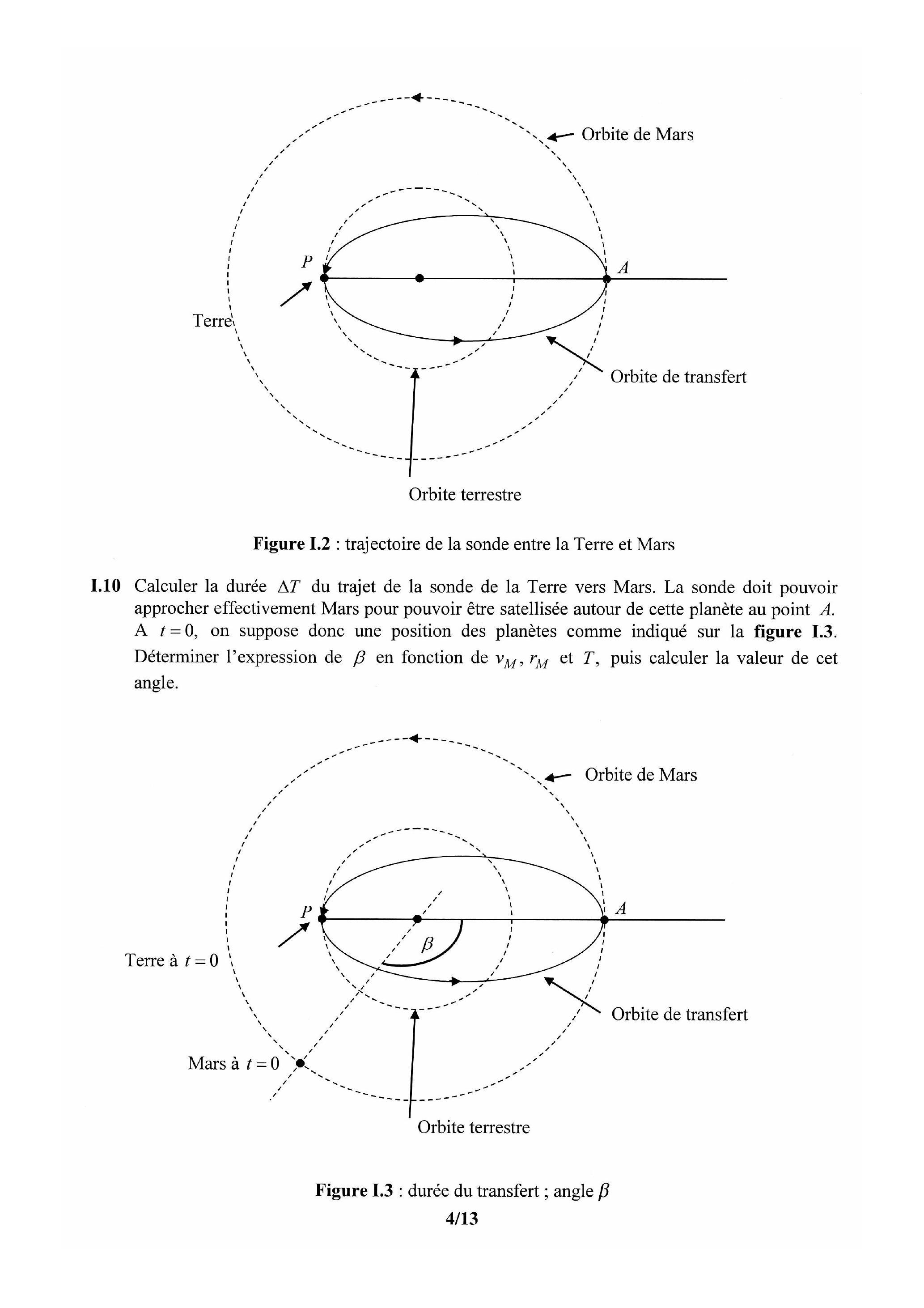 I. 10 Calculer la durée du trajet de la sonde de la Terre vers Mars. La sonde doit pouvoir approcher effectivement Mars pour pouvoir être satellisée autour de cette planète au point . A , on suppose donc une position des planètes comme indiqué sur la figure I.3. Déterminer l'expression de en fonction de et , puis calculer la valeur de cet angle.