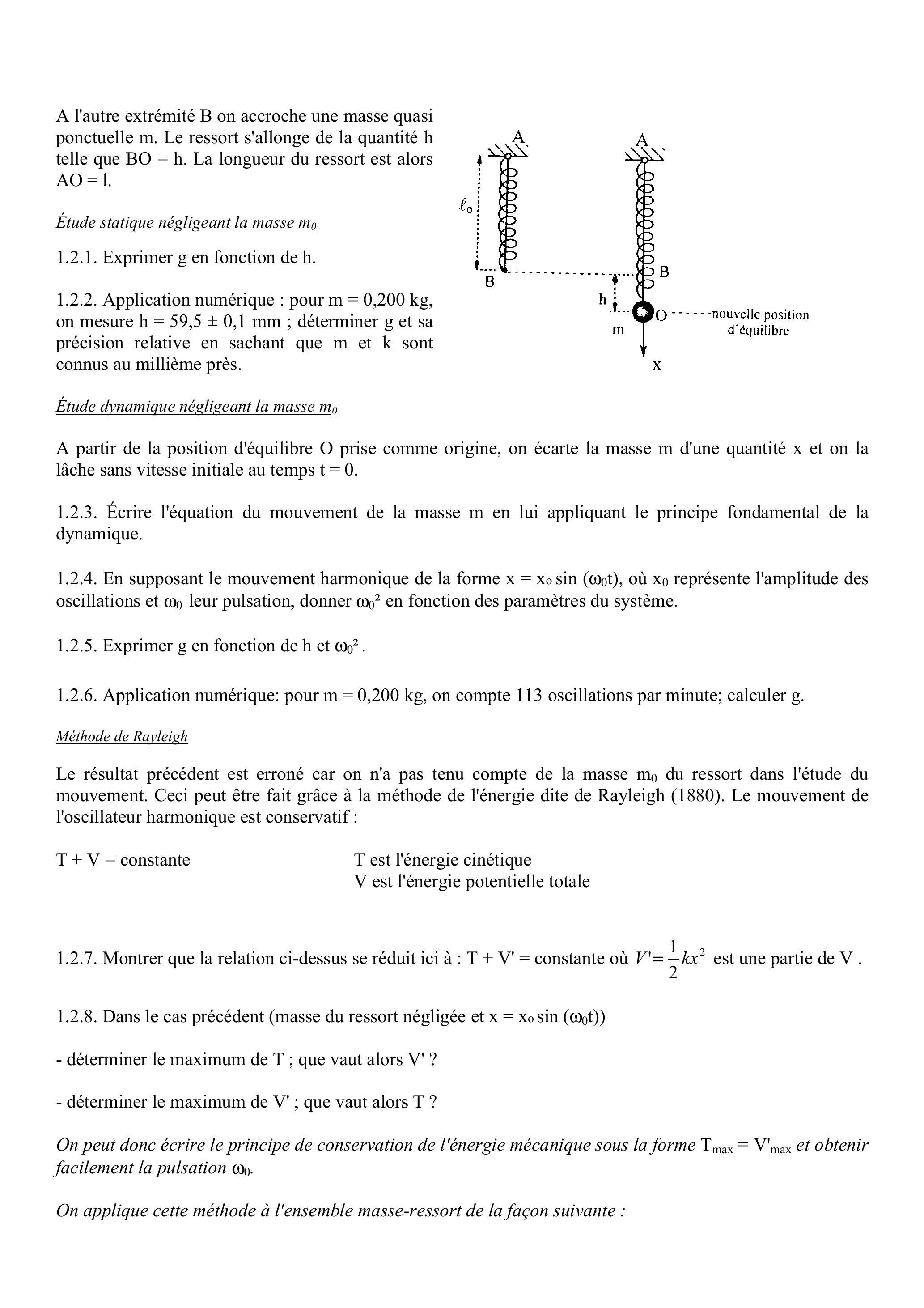 Un ressort à spires jointives de raideur k et de masse est suspendu verticalement par son extrémité A , en un lieu où l'accélération de la pesanteur est g . Sa longueur au repos est . On donne: ;