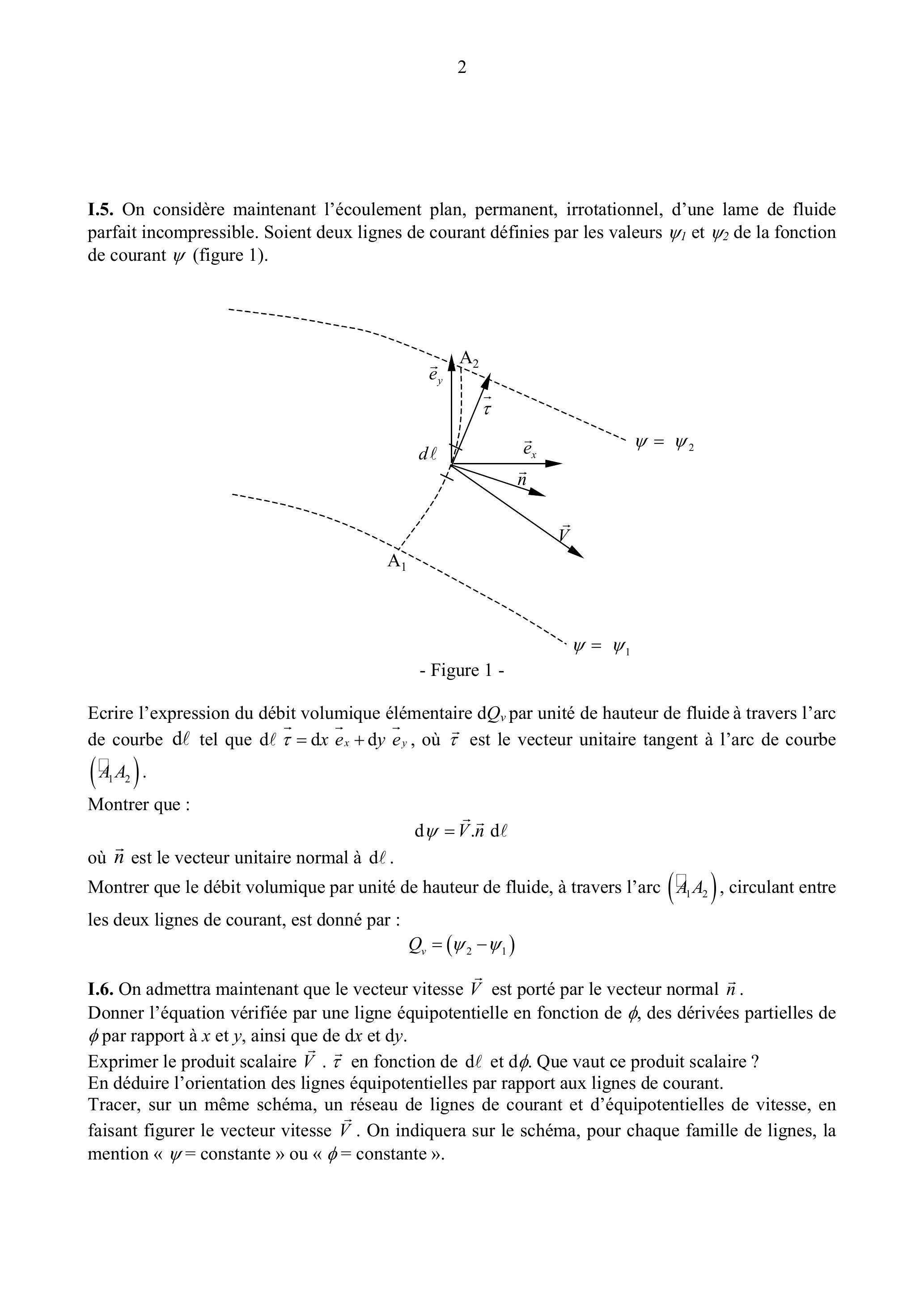 I.5. On considère maintenant l'écoulement plan, permanent, irrotationnel, d'une lame de fluide parfait incompressible. Soient deux lignes de courant définies par les valeurs et de la fonction de courant (figure 1).