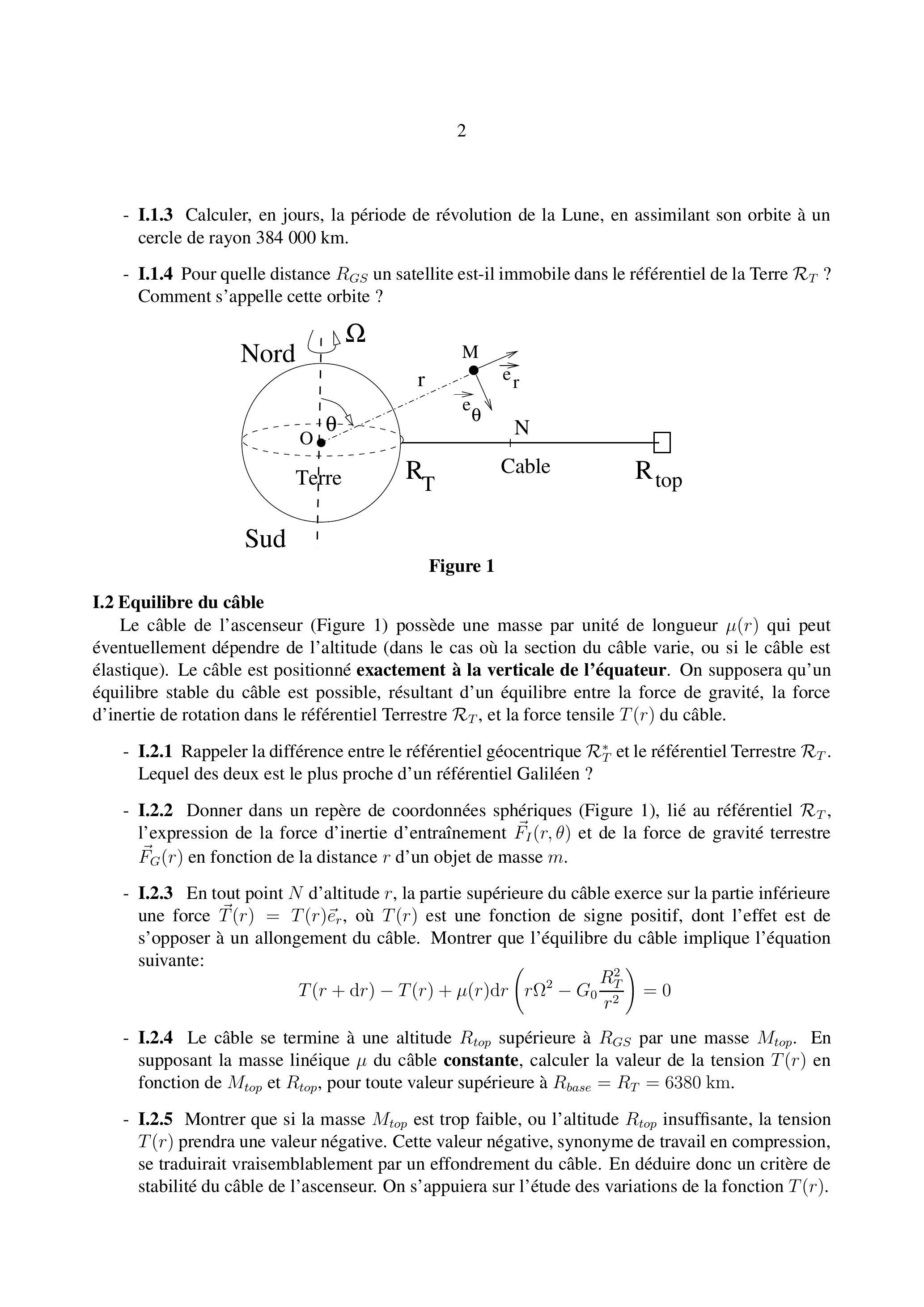 L'ascenseur spatial appartient au domaine de la science-fiction. Le concept, imaginé en 1960 par l'ingénieur soviétique Youri N. Artsutanov, fut popularisé par le romancier anglais Arthur C. Clarke en 1979 ("The fountain of paradise"). L'idée consiste à envoyer un câble très résistant au dessus de l'équateur et à s'en servir pour lever des charges en direction de l'orbite terrestre, tel un ascenseur géant. Le but de ce problème est d'étudier quelques aspects physiques d'une telle réalisation.