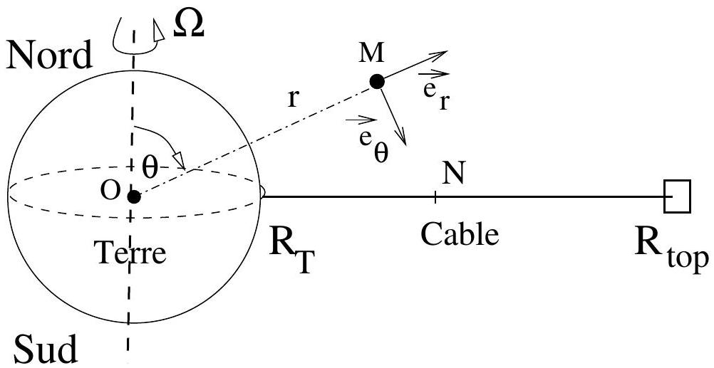 qui peut éventuellement dépendre de l'altitude (dans le cas où la section du câble varie, ou si le câble est élastique). Le câble est positionné exactement à la verticale de l'équateur. On supposera qu'un équilibre stable du câble est possible, résultant d'un équilibre entre la force de gravité, la force d'inertie de rotation dans le référentiel Terrestre