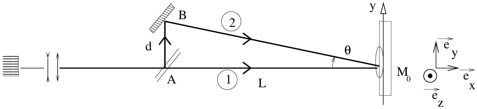 avec le faisceau numéro 1 . On néglige le déphasage dû à la lame semi-réfléchissante sur le trajet du faisceau numero 1, et on admet que les réflexions en A et B ne changent pas la phase du faisceau numero 2. On introduit les distances