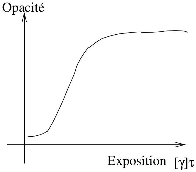 provoque le noircissement d'un film photographique. On appelle "opacité" du film, après développement, le rapport entre l'intensité lumineuse transmise à travers le film et l'intensité lumineuse incidente. Le développement du film ne révèle une exposition que si la concentration est supérieure à une valeur de seuil , et on fait l'hypothèse que l'opacité est proportionnelle à la différence . Un film non exposé présente toujours un léger voile d'opacité égale à . Montrer que ce modèle rend compte qualitativement de la courbe de noircissement d'un film photographique schématisée sur la Figure 3.
