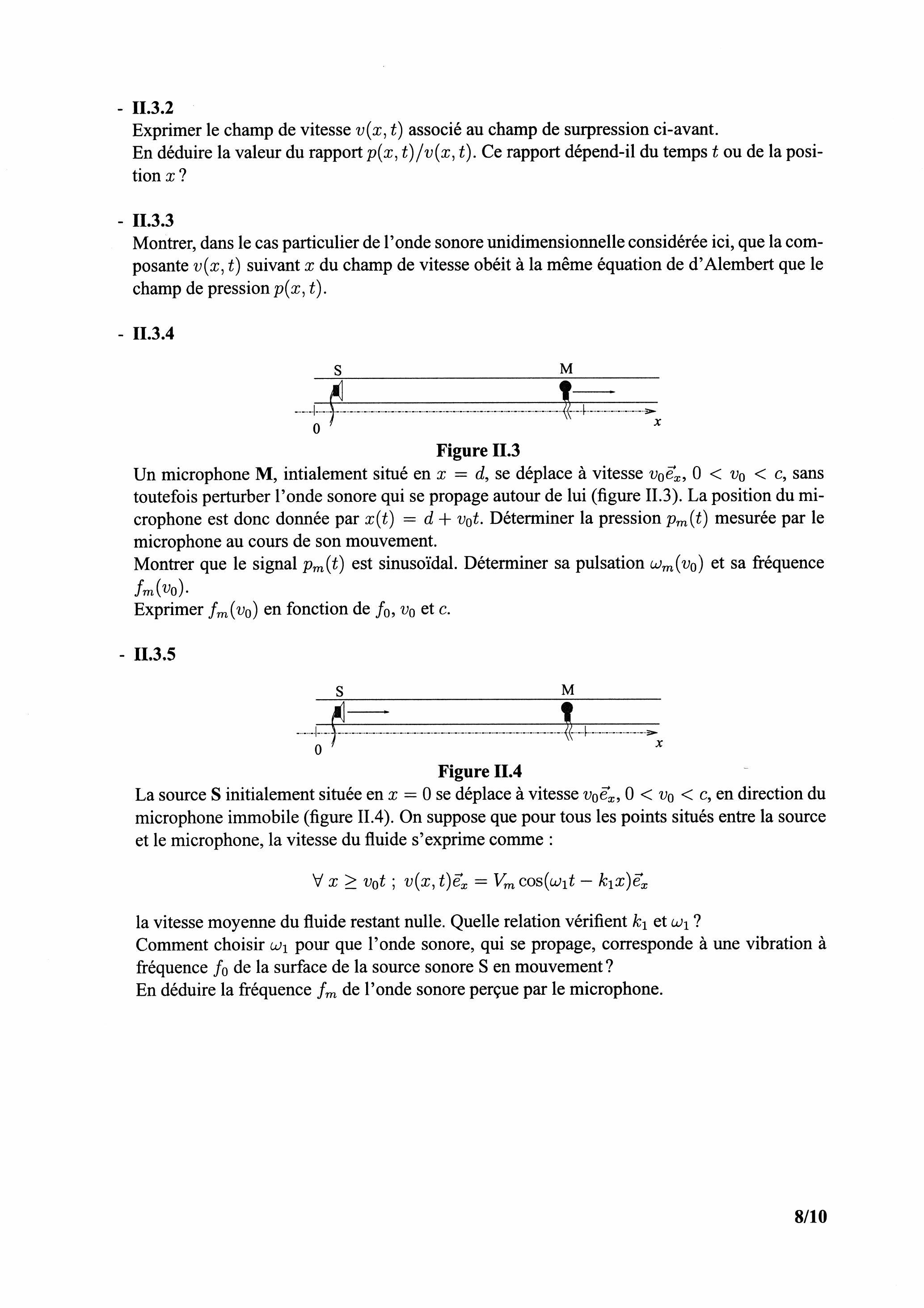 Un microphone , intialement situé en , se déplace à vitesse , sans toutefois perturber l'onde sonore qui se propage autour de lui (figure II.3). La position du microphone est donc donnée par . Déterminer la pression mesurée par le microphone au cours de son mouvement.