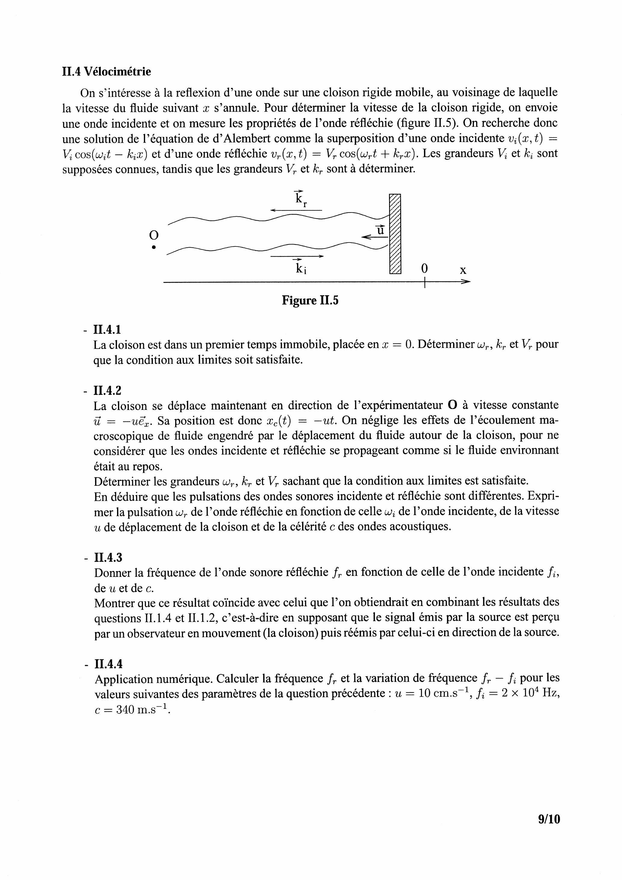 En déduire que les pulsations des ondes sonores incidente et réfléchie sont différentes. Exprimer la pulsation de l'onde réfléchie en fonction de celle de l'onde incidente, de la vitesse de déplacement de la cloison et de la célérité des ondes acoustiques.