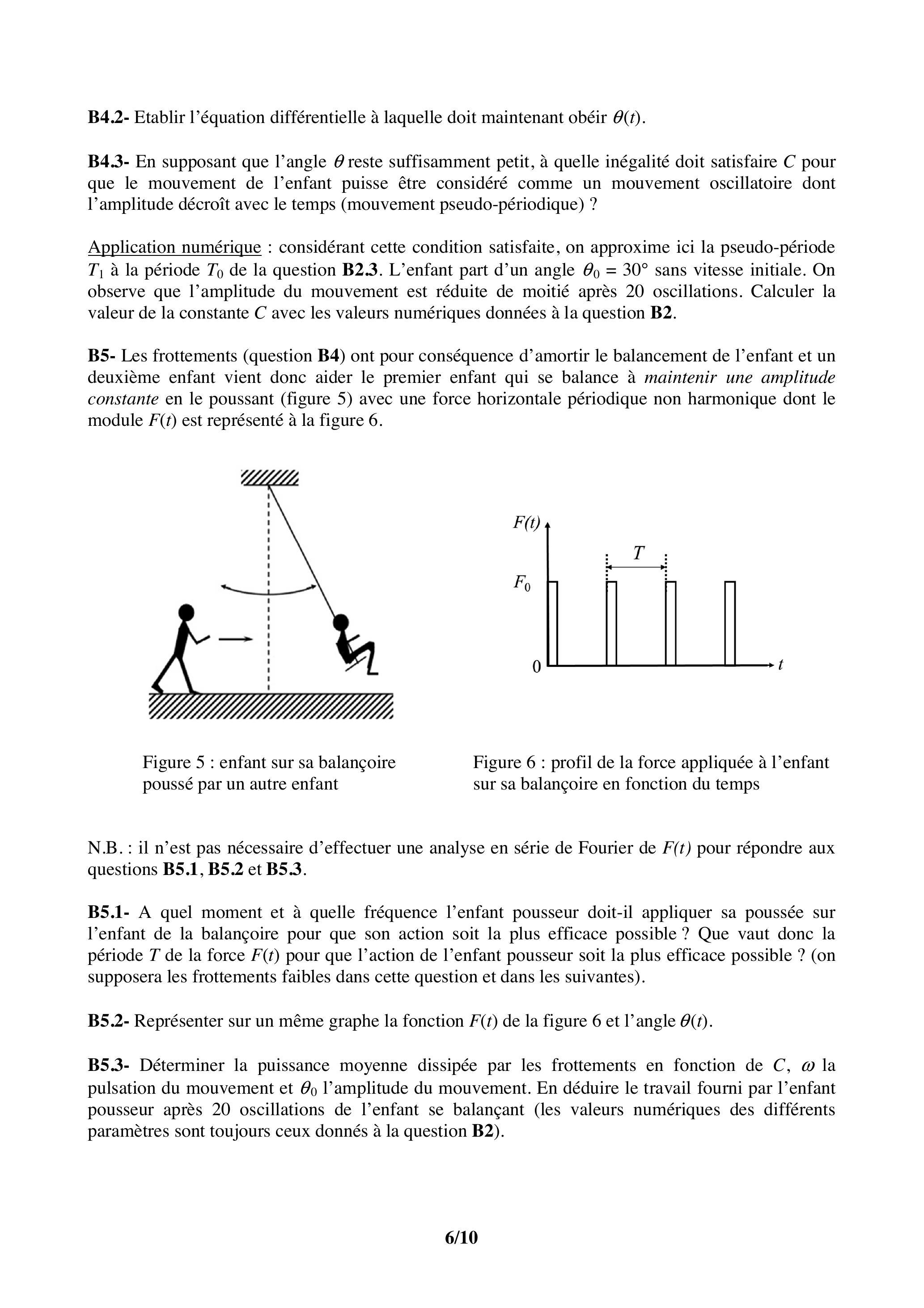 B5- Les frottements (question B4) ont pour conséquence d'amortir le balancement de l'enfant et un deuxième enfant vient donc aider le premier enfant qui se balance à maintenir une amplitude constante en le poussant (figure 5) avec une force horizontale périodique non harmonique dont le module