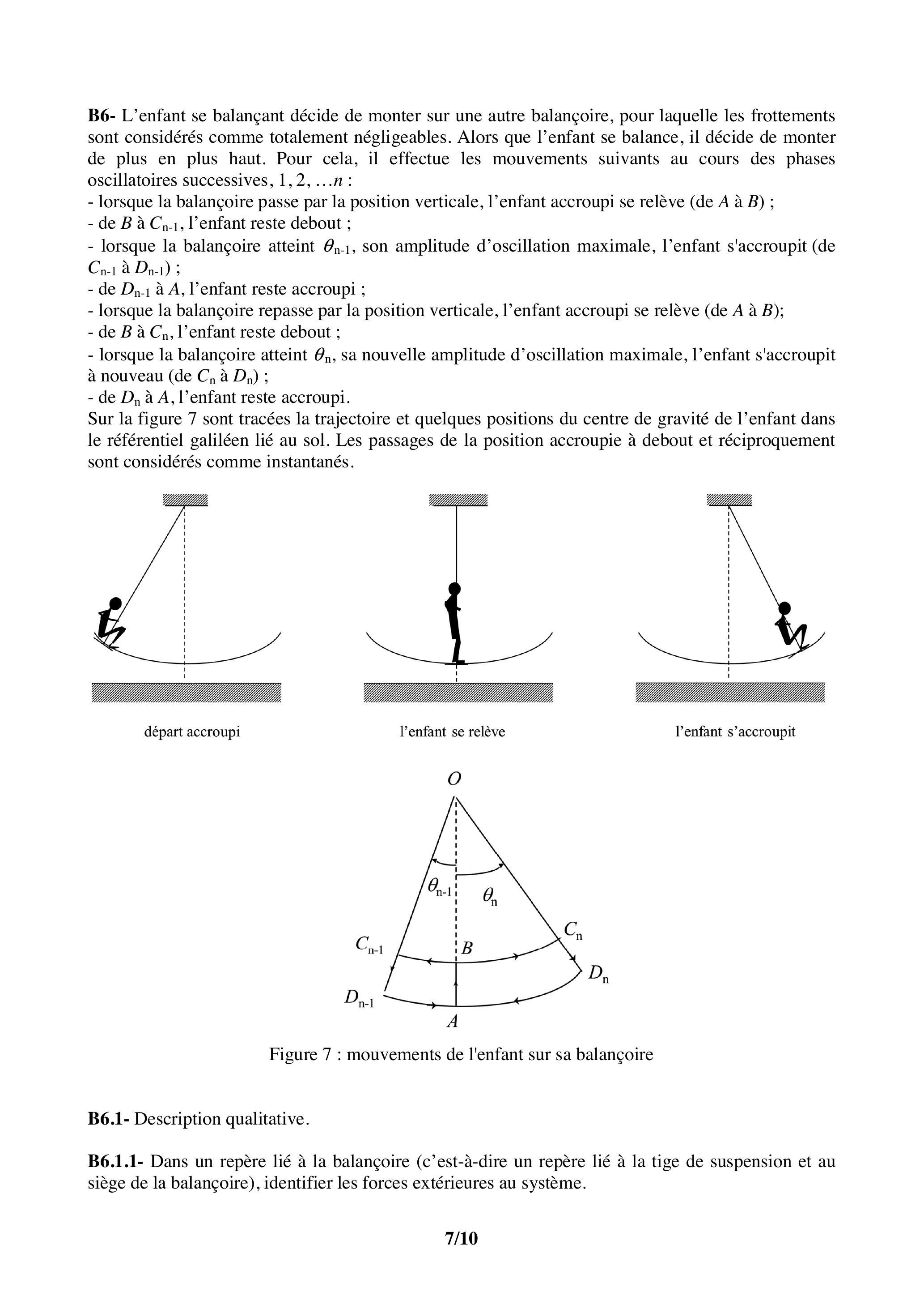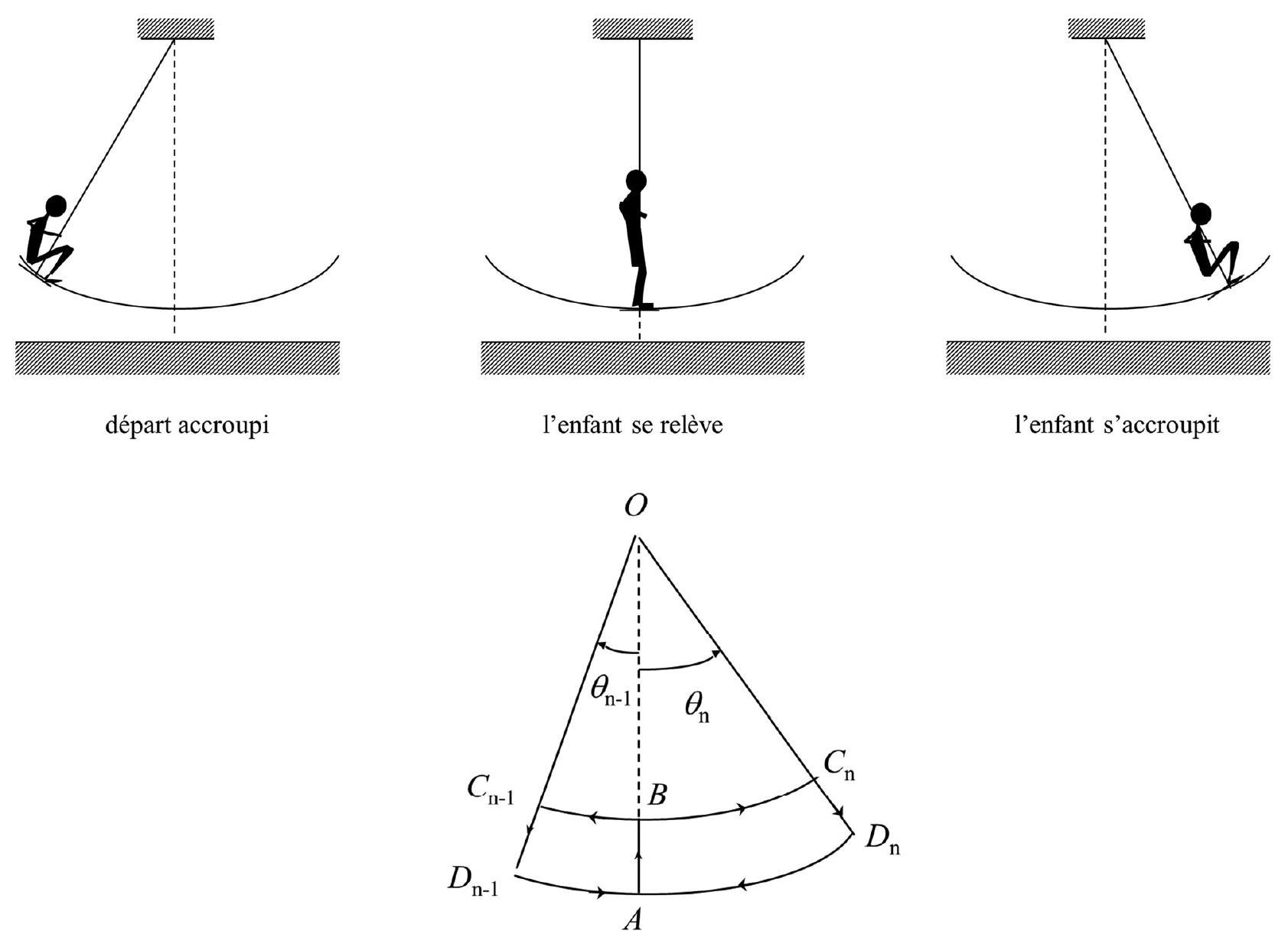 B6- L'enfant se balançant décide de monter sur une autre balançoire, pour laquelle les frottements sont considérés comme totalement négligeables. Alors que l'enfant se balance, il décide de monter de plus en plus haut. Pour cela, il effectue les mouvements suivants au cours des phases oscillatoires successives,