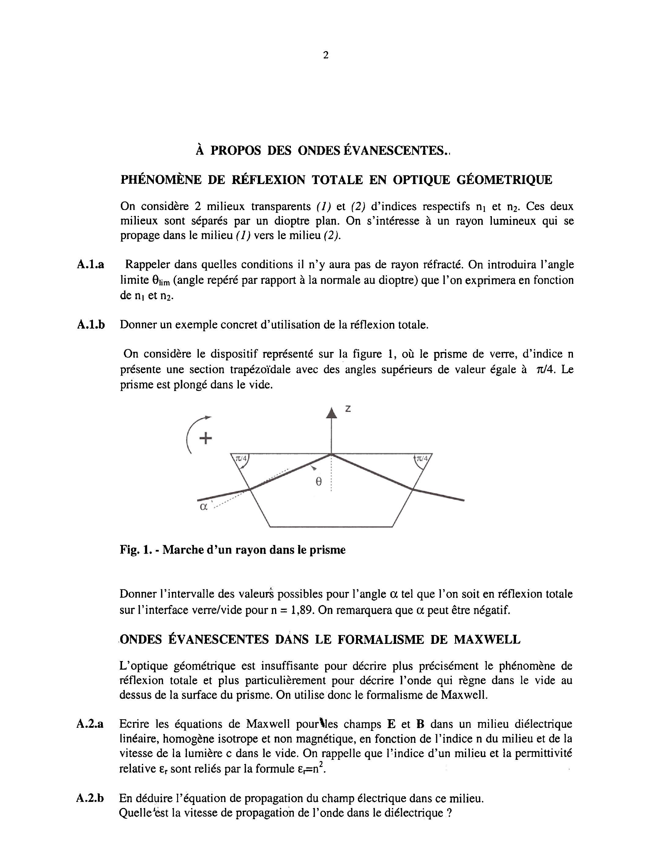 A.1.a Rappeler dans quelles conditions il n'y aura pas de rayon réfracté. On introduira l'angle limite (angle repéré par rapport à la normale au dioptre) que l'on exprimera en fonction de et .