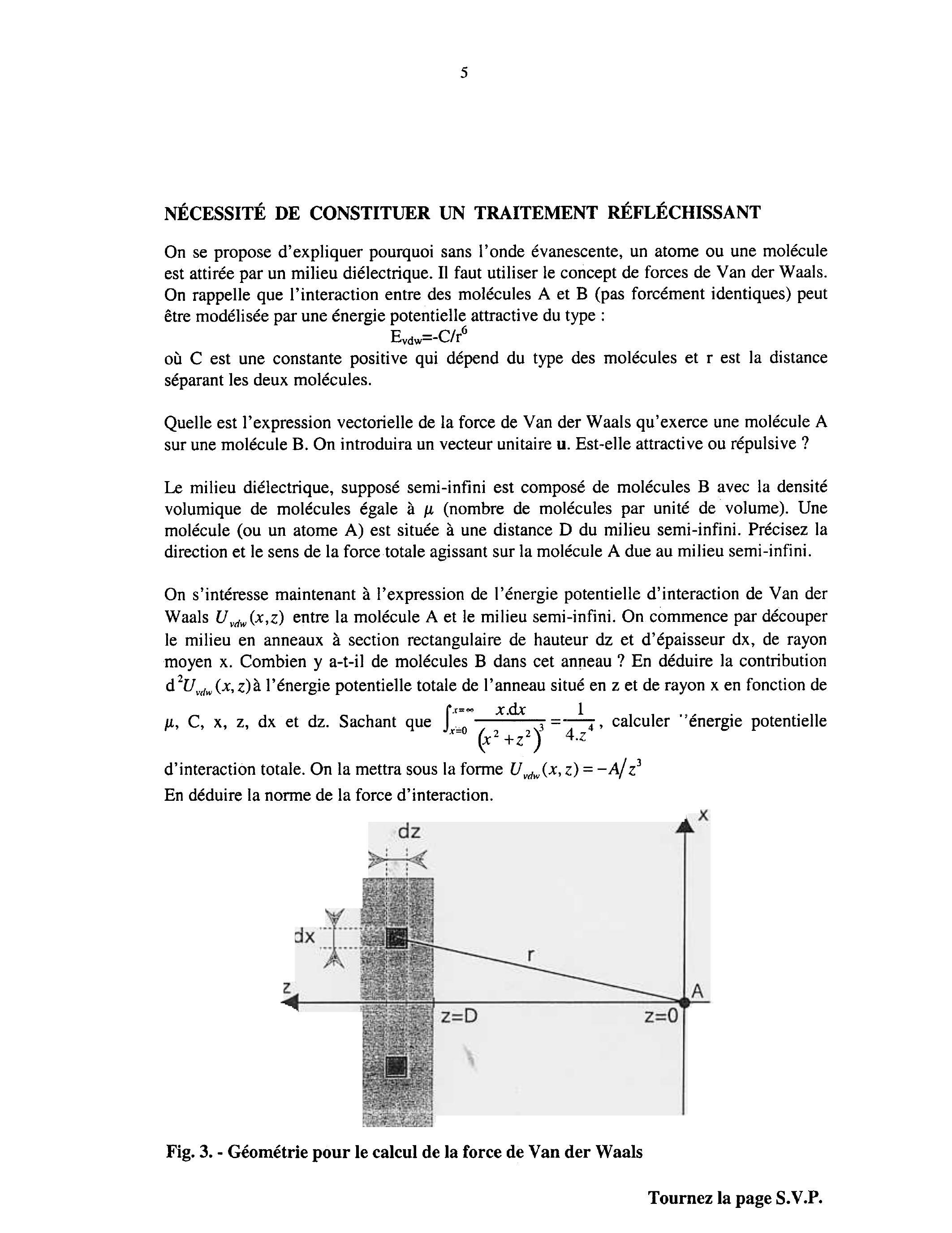 On se propose d'expliquer pourquoi sans l'onde évanescente, un atome ou une molécule est attirée par un milieu diélectrique. Il faut utiliser le concept de forces de Van der Waals. On rappelle que l'interaction entre des molécules et (pas forcément identiques) peut être modélisée par une énergie potentielle attractive du type :