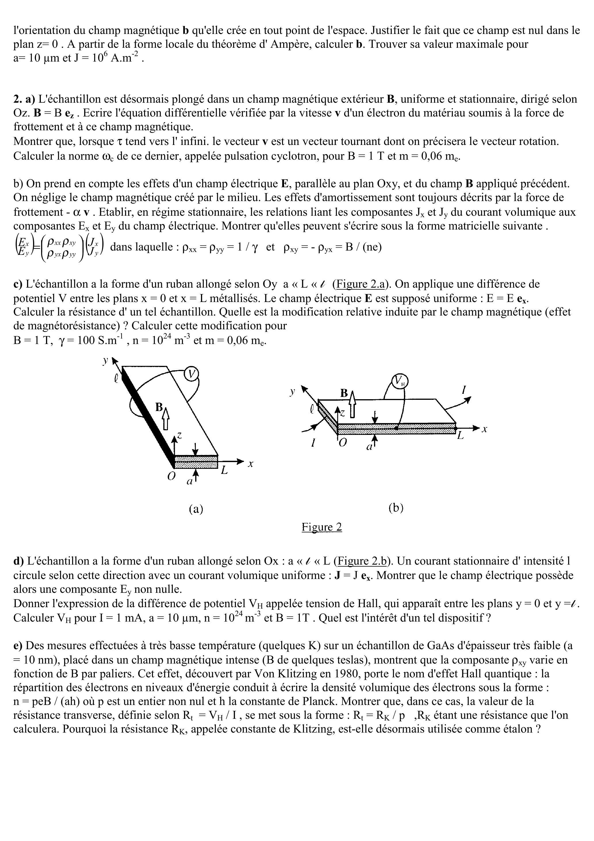 c) L'échantillon a la forme d'un ruban allongé selon Oy a «L « (Figure 2.a). On applique une différence de potentiel V entre les plans et métallisés. Le champ électrique est supposé uniforme : . Calculer la résistance d' un tel échantillon. Quelle est la modification relative induite par le champ magnétique (effet de magnétorésistance) ? Calculer cette modification pour et .