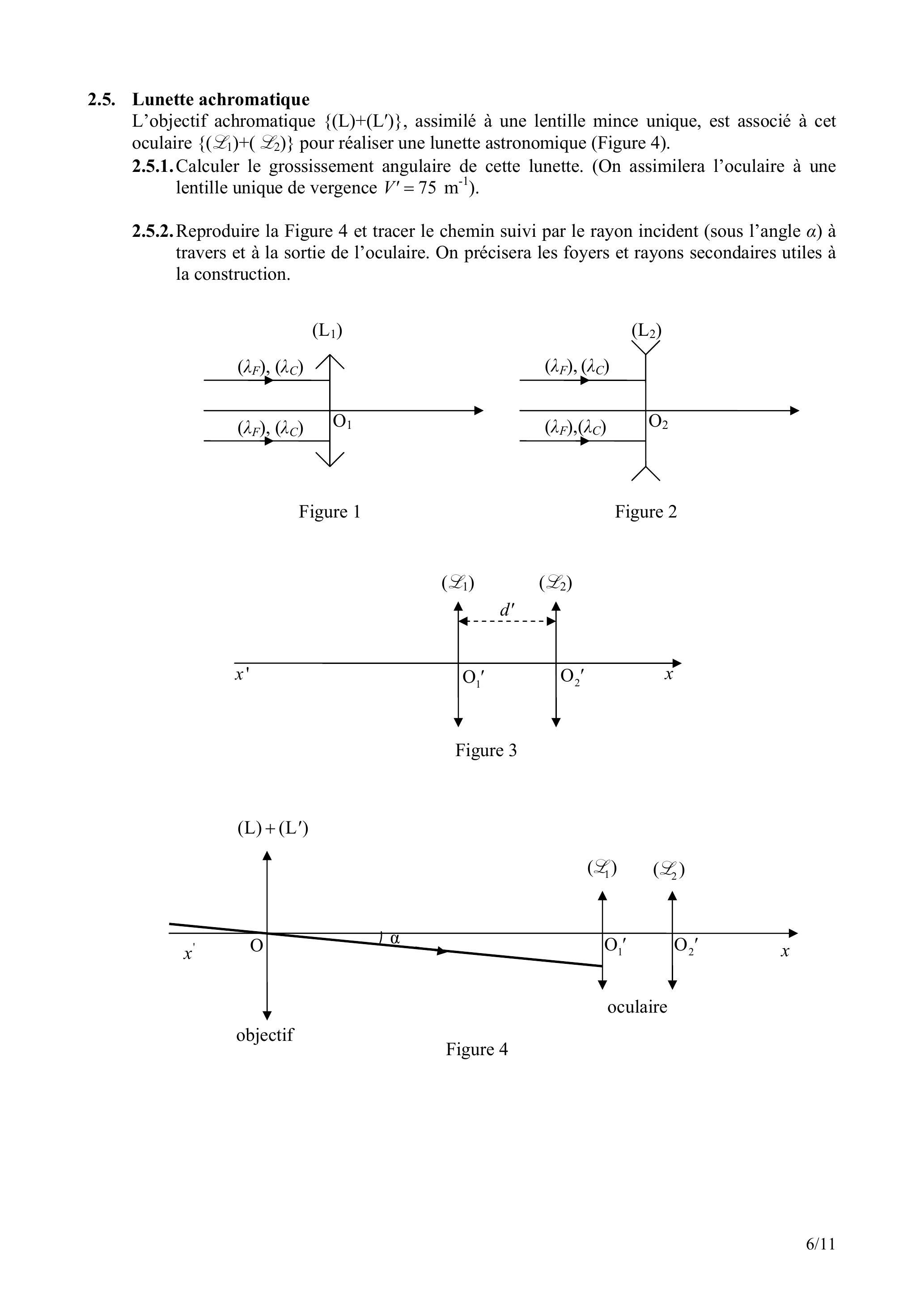 2.2.1. Reproduire les figures 1 et 2 et tracer le cheminement des rayons lumineux bleu et rouge de longueurs d'onde respectives ( ) et ( ) émergeant des lentilles ( ) et ( ), en indiquant pour chacune de ces deux lentilles la position relative des foyers et sur l'axe optique.