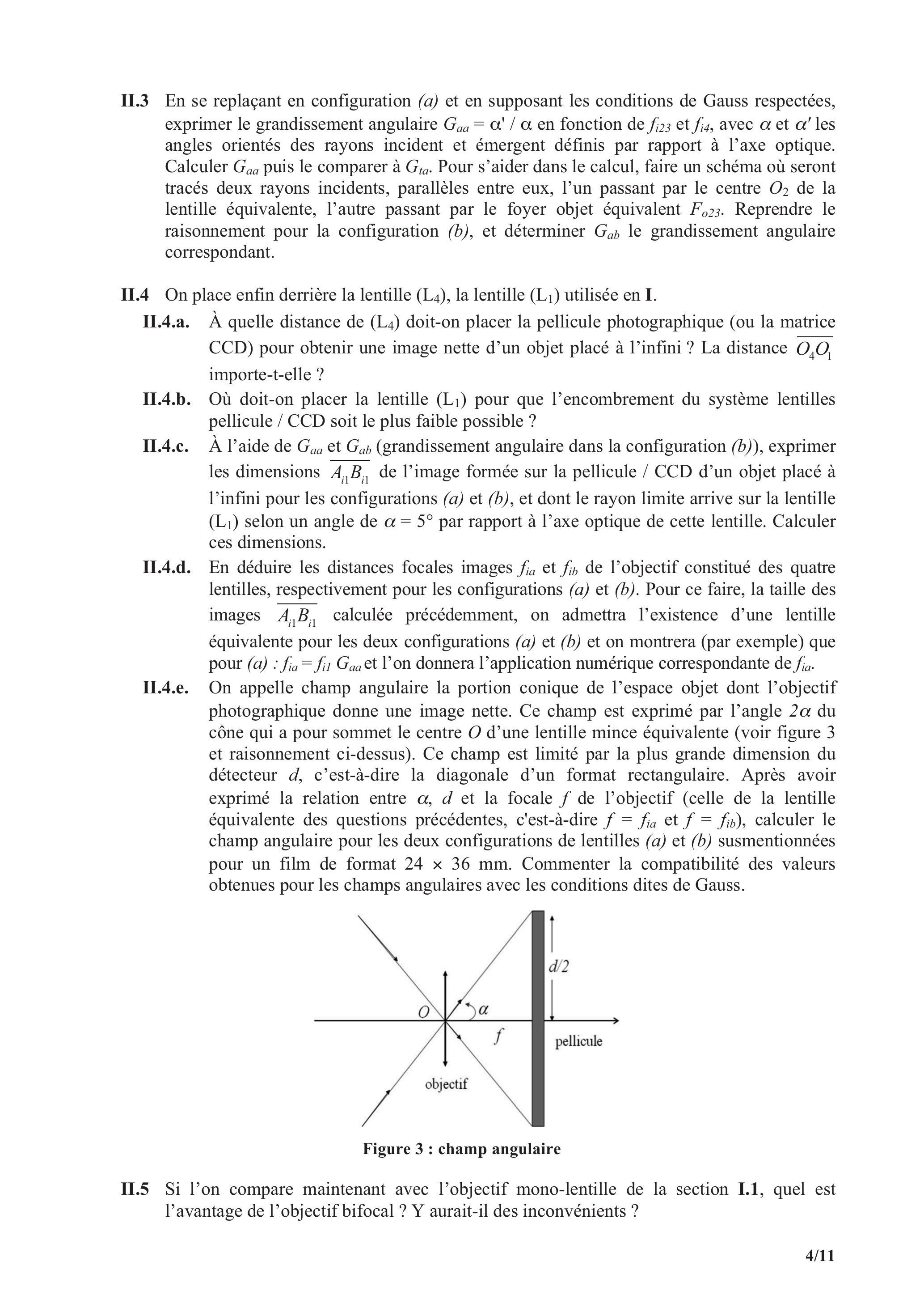 II.4.e. On appelle champ angulaire la portion conique de l'espace objet dont l'objectif photographique donne une image nette. Ce champ est exprimé par l'angle du cône qui a pour sommet le centre d'une lentille mince équivalente (voir figure 3 et raisonnement ci-dessus). Ce champ est limité par la plus grande dimension du détecteur , c'est-à-dire la diagonale d'un format rectangulaire. Après avoir exprimé la relation entre et la focale de l'objectif (celle de la lentille équivalente des questions précédentes, c'est-à-dire et ), calculer le champ angulaire pour les deux configurations de lentilles (a) et (b) susmentionnées pour un film de format . Commenter la compatibilité des valeurs obtenues pour les champs angulaires avec les conditions dites de Gauss.