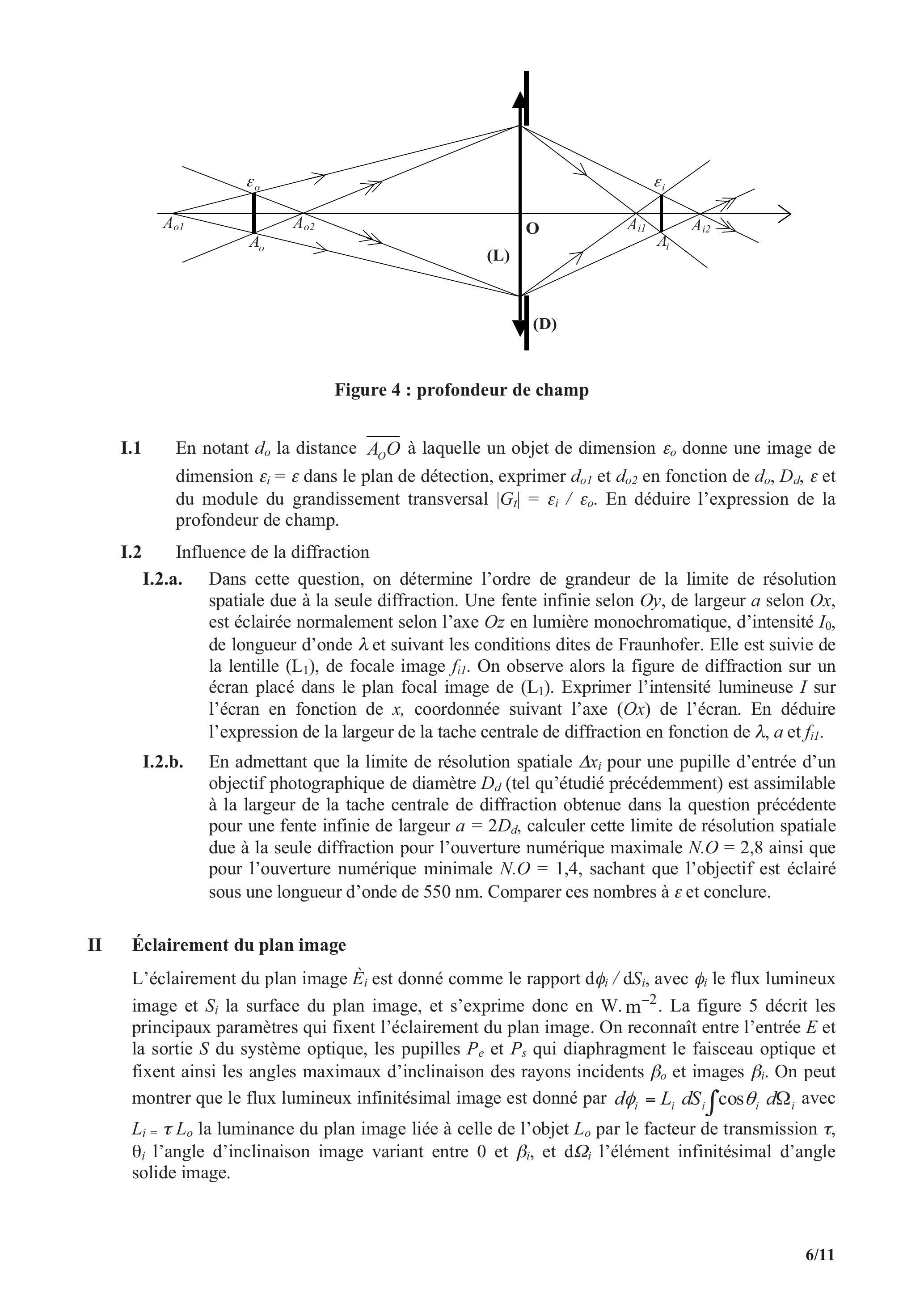 I. 1 En notant la distance à laquelle un objet de dimension donne une image de dimension dans le plan de détection, exprimer et en fonction de et du module du grandissement transversal . En déduire l'expression de la profondeur de champ.