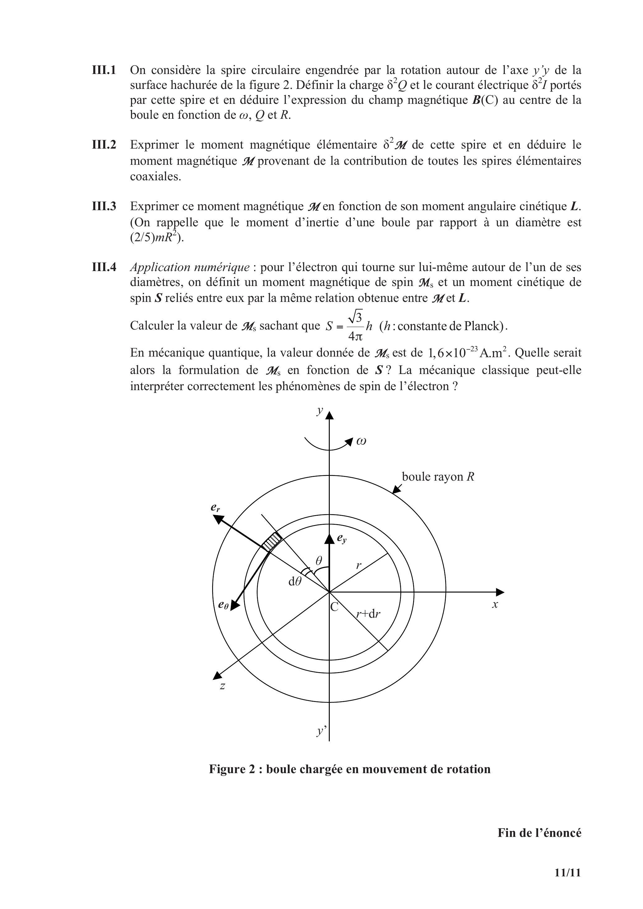 III. 4 Application numérique : pour l'électron qui tourne sur lui-même autour de l'un de ses diamètres, on définit un moment magnétique de spin et un moment cinétique de spin reliés entre eux par la même relation obtenue entre et .