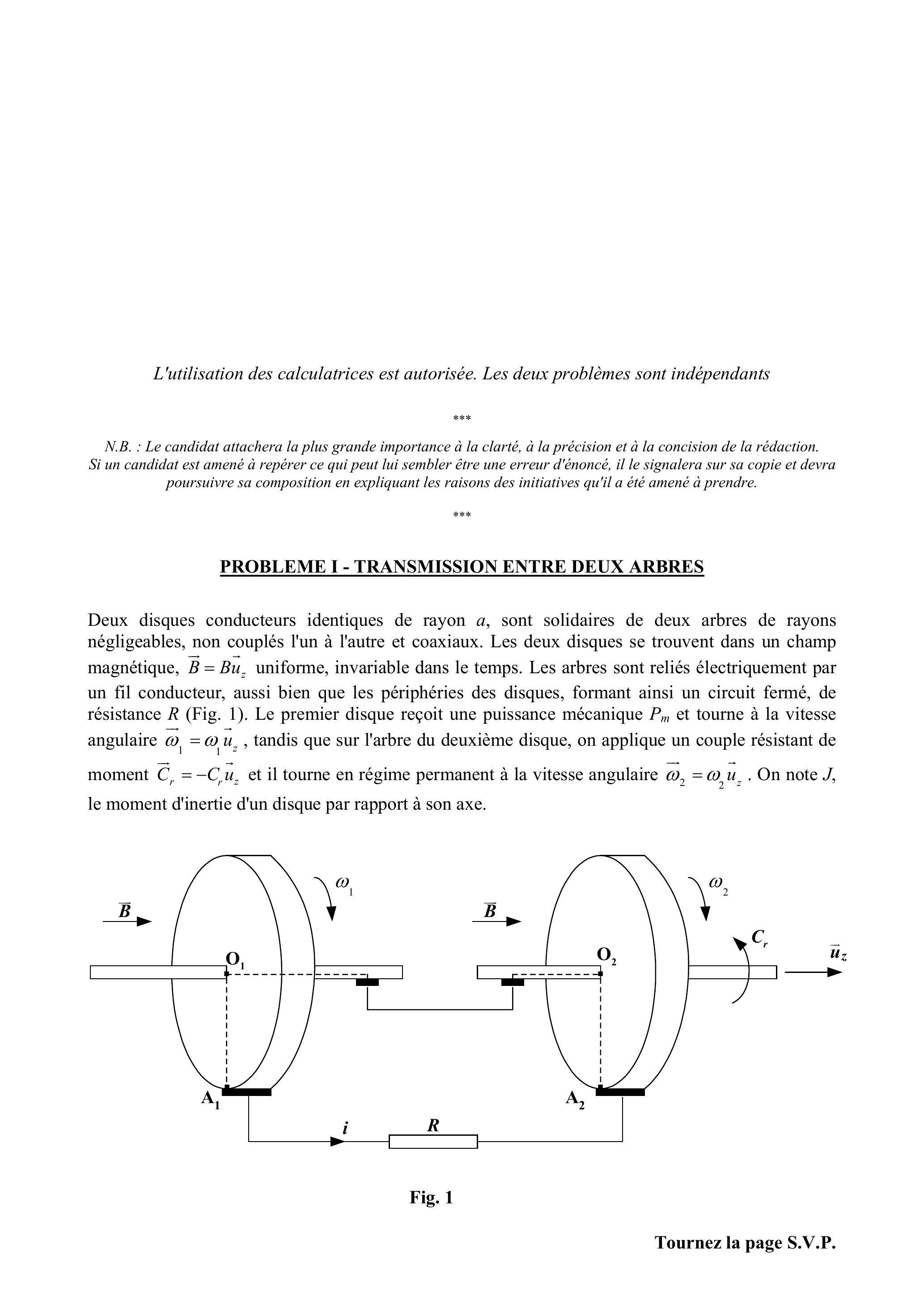 Deux disques conducteurs identiques de rayon , sont solidaires de deux arbres de rayons négligeables, non couplés l'un à l'autre et coaxiaux. Les deux disques se trouvent dans un champ magnétique, uniforme, invariable dans le temps. Les arbres sont reliés électriquement par un fil conducteur, aussi bien que les périphéries des disques, formant ainsi un circuit fermé, de résistance (Fig. 1). Le premier disque reçoit une puissance mécanique et tourne à la vitesse angulaire , tandis que sur l'arbre du deuxième disque, on applique un couple résistant de moment et il tourne en régime permanent à la vitesse angulaire . On note , le moment d'inertie d'un disque par rapport à son axe.