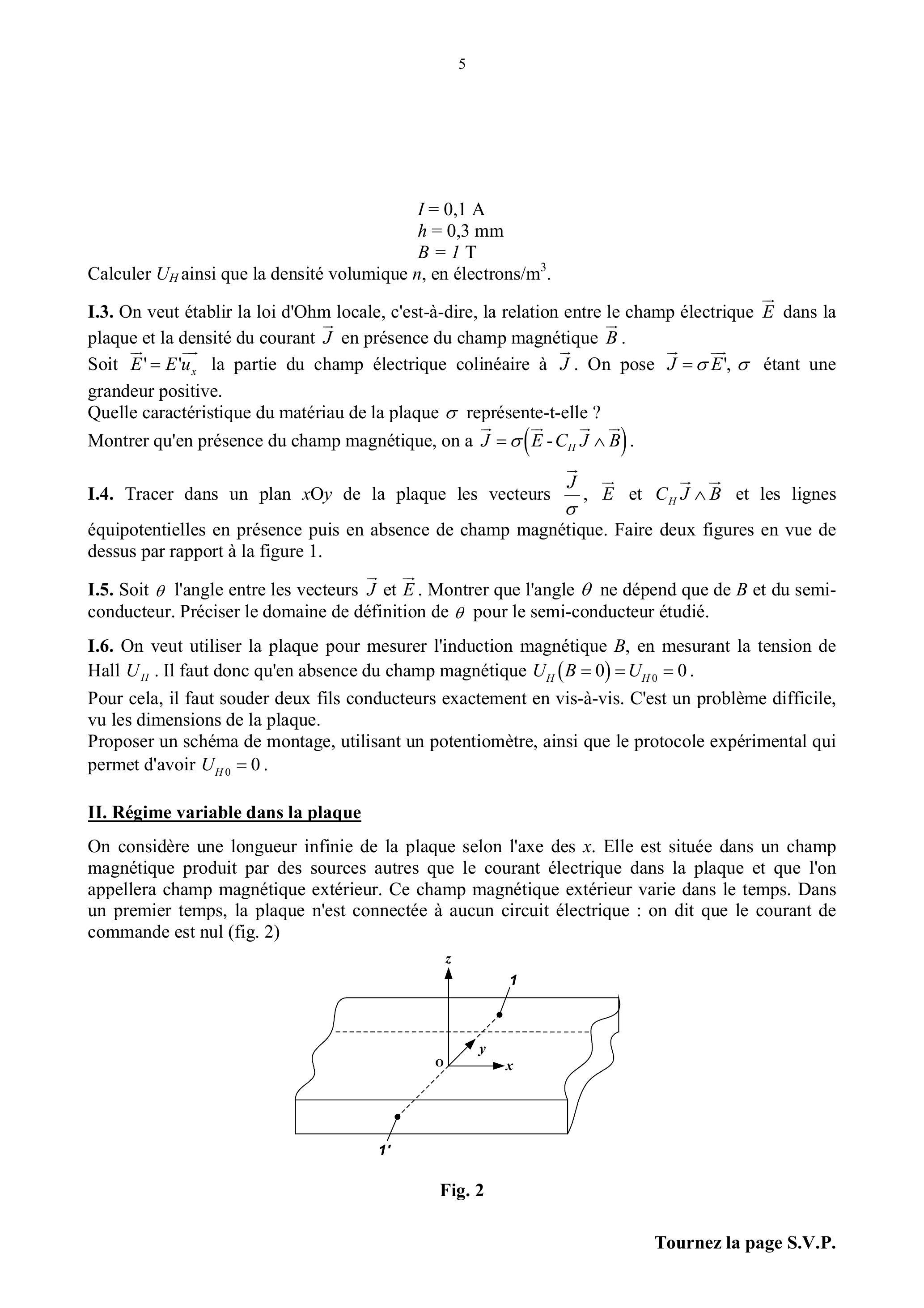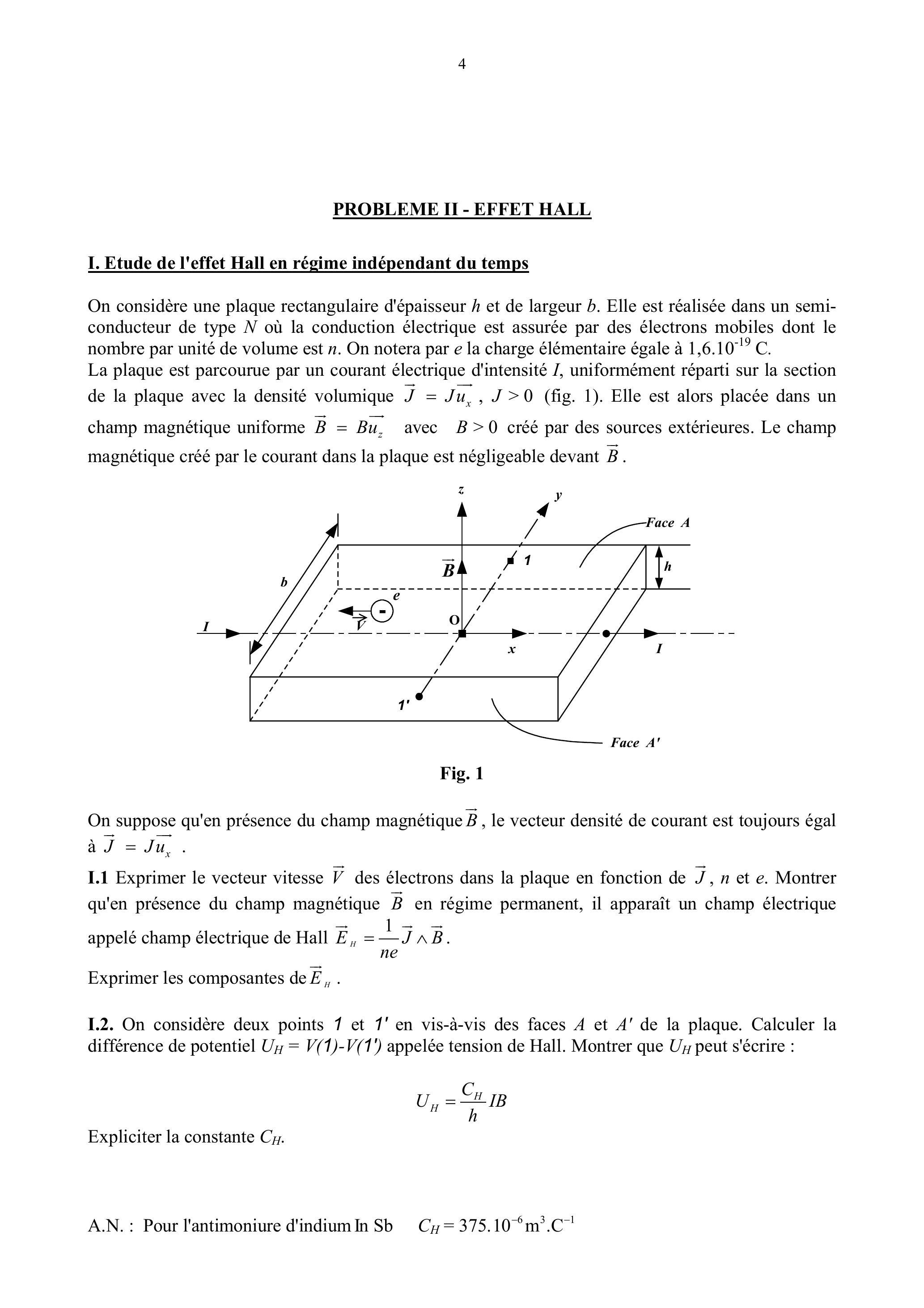 I. 1 Exprimer le vecteur vitesse des électrons dans la plaque en fonction de et . Montrer qu'en présence du champ magnétique en régime permanent, il apparaît un champ électrique appelé champ électrique de Hall .