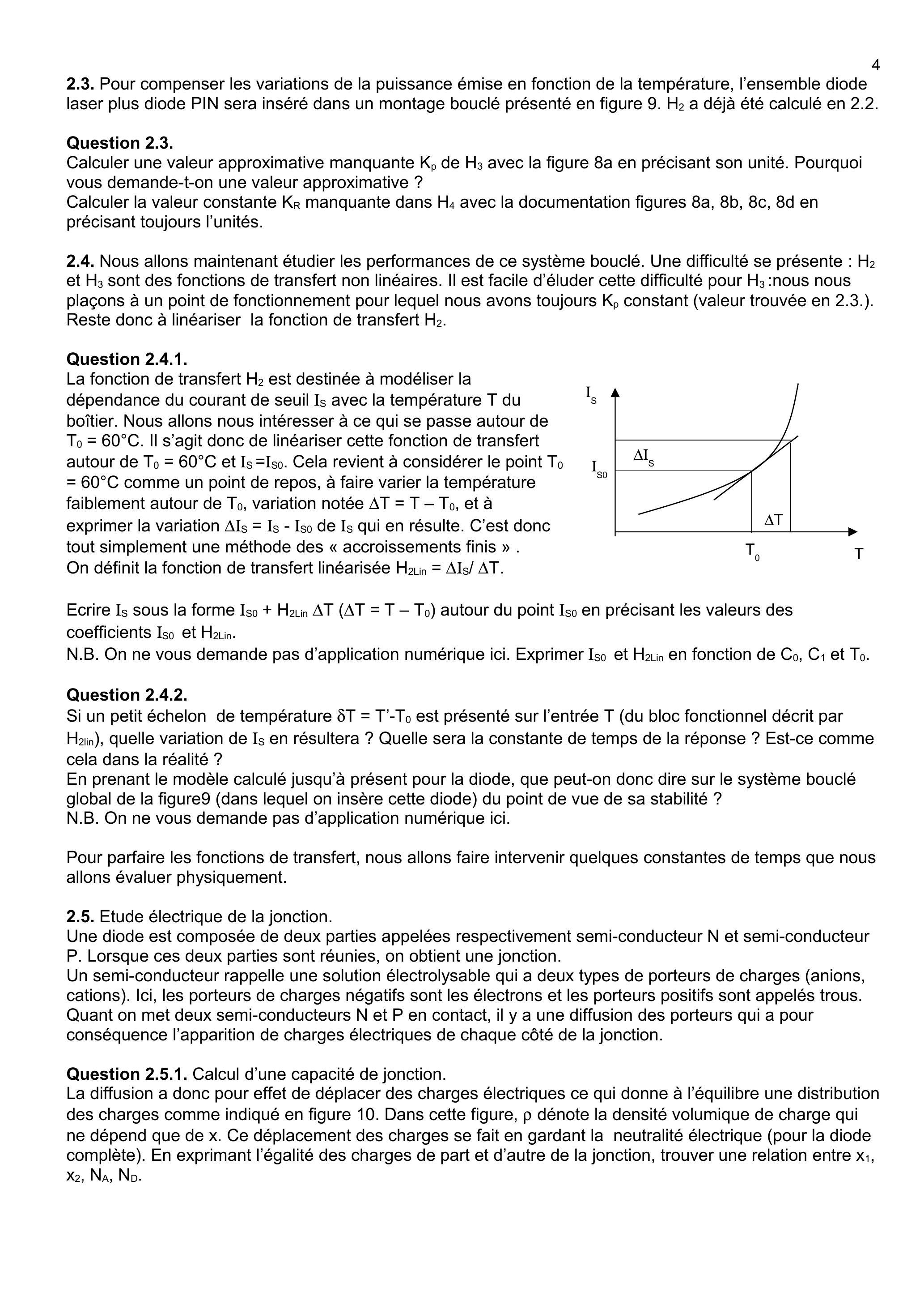 La fonction de transfert est destinée à modéliser la dépendance du courant de seuil avec la température T du boîtier. Nous allons nous intéresser à ce qui se passe autour de . Il s'agit donc de linéariser cette fonction de transfert autour de et . Cela revient à considérer le point comme un point de repos, à faire varier la température faiblement autour de , variation notée , et à exprimer la variation de qui en résulte. C'est donc tout simplement une méthode des «accroissements finis». On définit la fonction de transfert linéarisée .