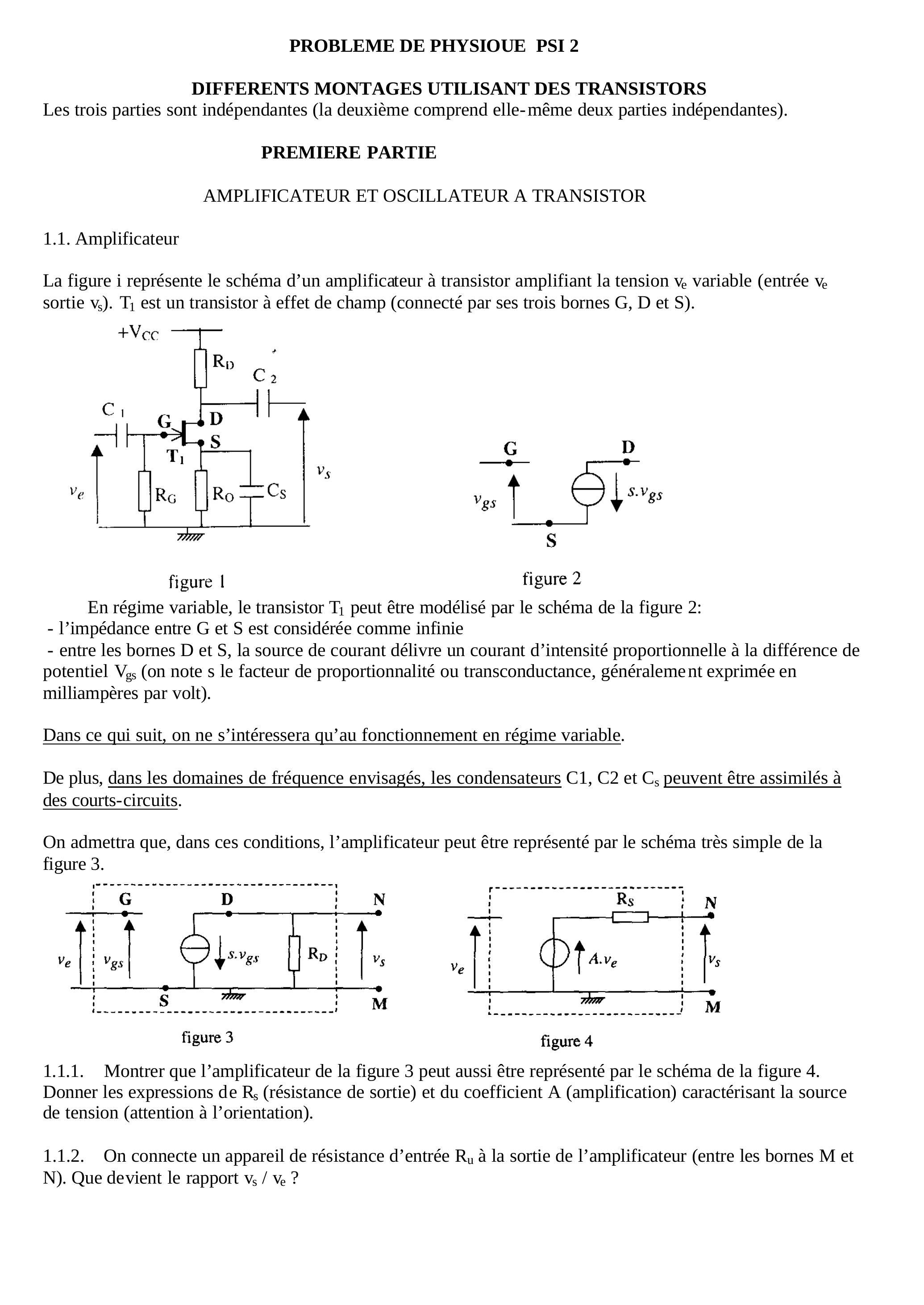 La figure i représente le schéma d'un amplificateur à transistor amplifiant la tension variable (entrée sortie ). est un transistor à effet de champ (connecté par ses trois bornes et S ).