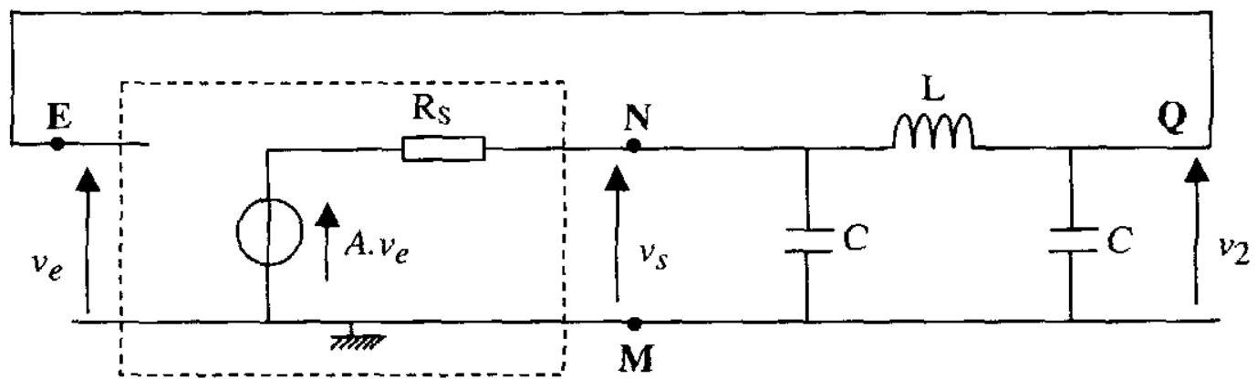 On complète le montage amplificateur de la figure 4 avec deux condensateurs de capacité C et une inductance pure L et on connecte les bornes Q et E (figure 5).