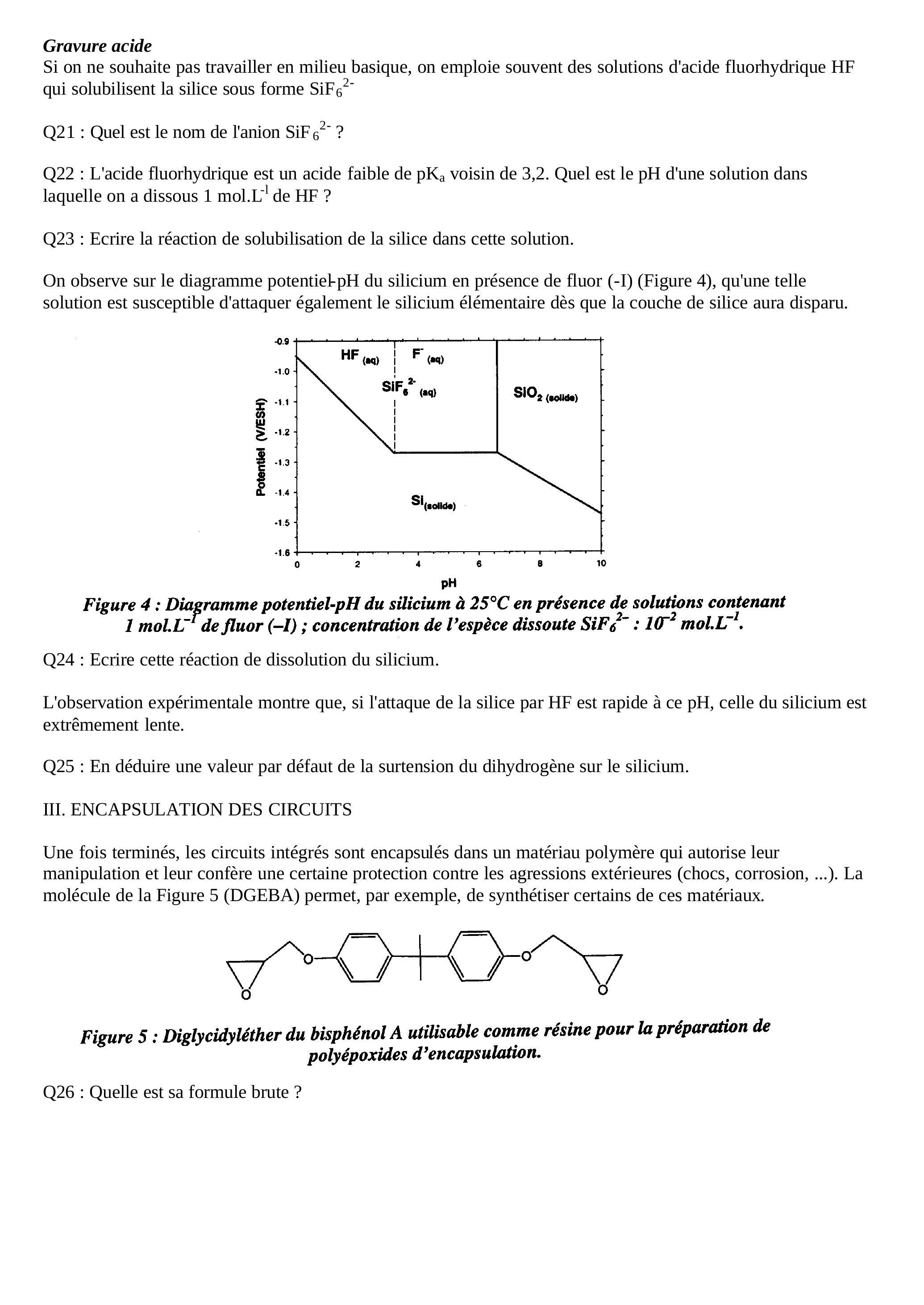 On observe sur le diagramme potentiel-pH du silicium en présence de fluor (-I) (Figure 4), qu'une telle solution est susceptible d'attaquer également le silicium élémentaire dès que la couche de silice aura disparu.