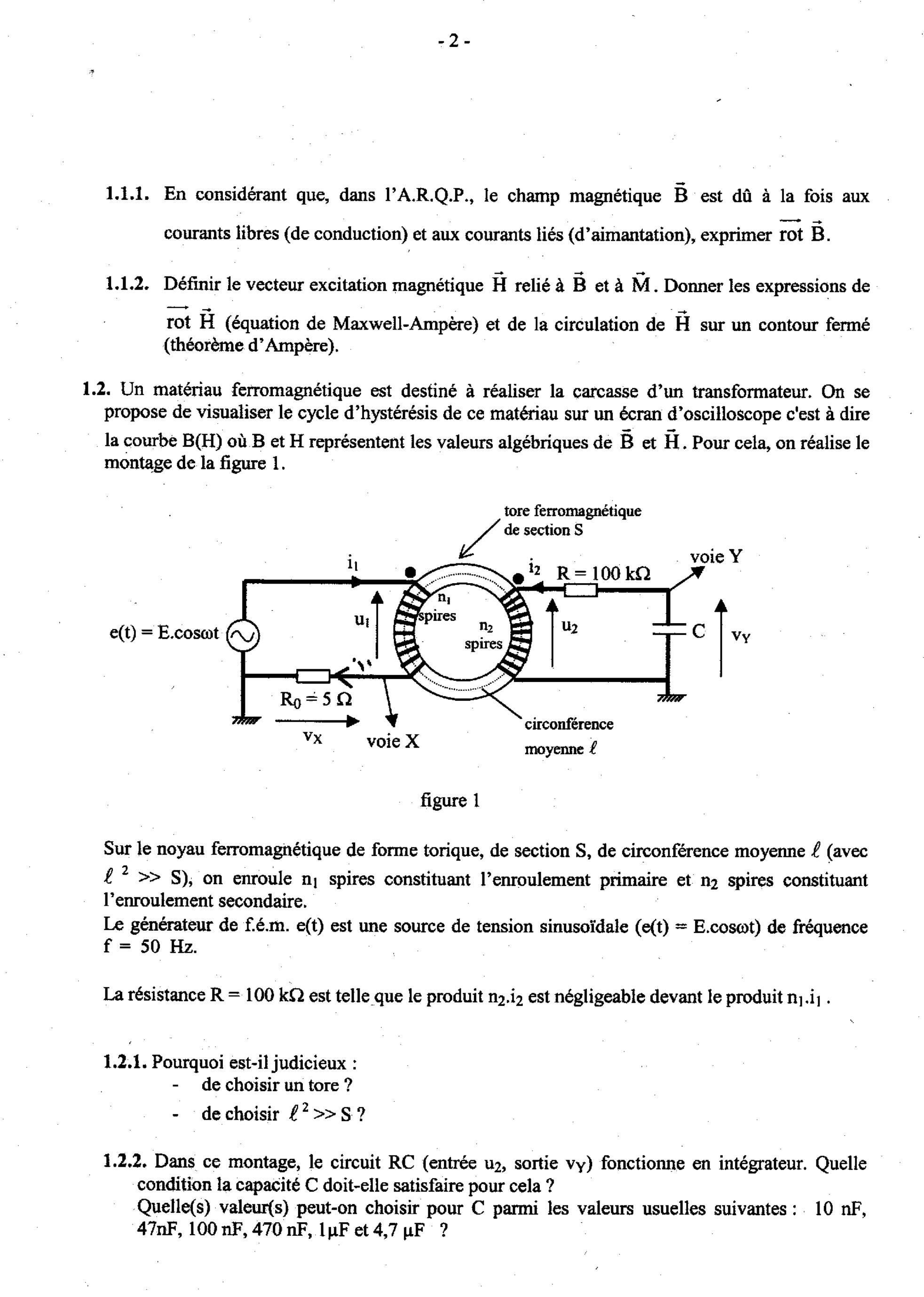 1.2. Un matériau ferromagnétique est destiné à réaliser la carcasse d'un transformateur. On se propose de visualiser le cycle d'hystérésis de ce matériau sur un écran d'oscilloscope c'est à dire la courbe et représentent les valeurs algébriques de et . Pour cela, on réalise le montage de la figure 1.