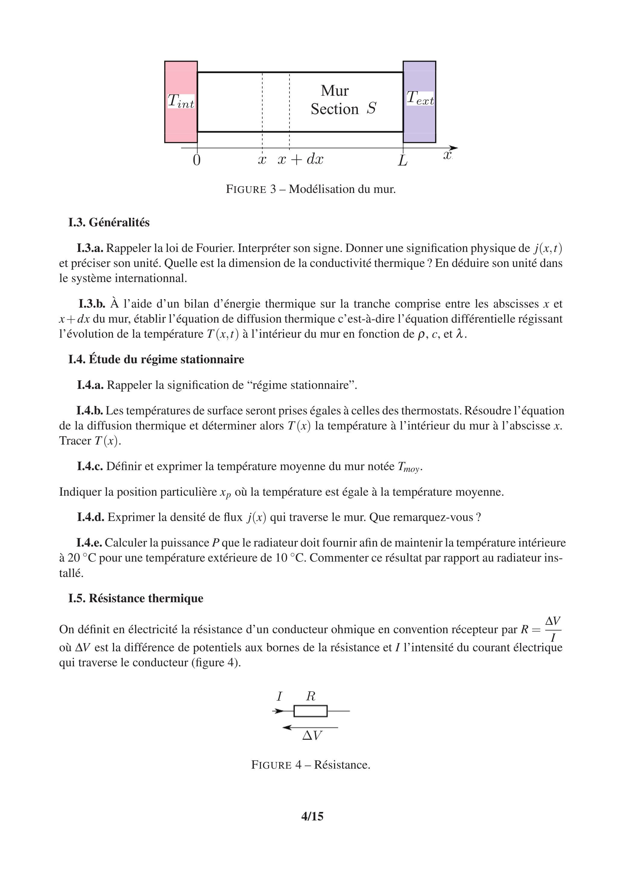 On étudie la conduction thermique dans le mur modélisé par une barre de section , de longueur en contact avec deux thermostats de températures et (voir figure 3, page 4).