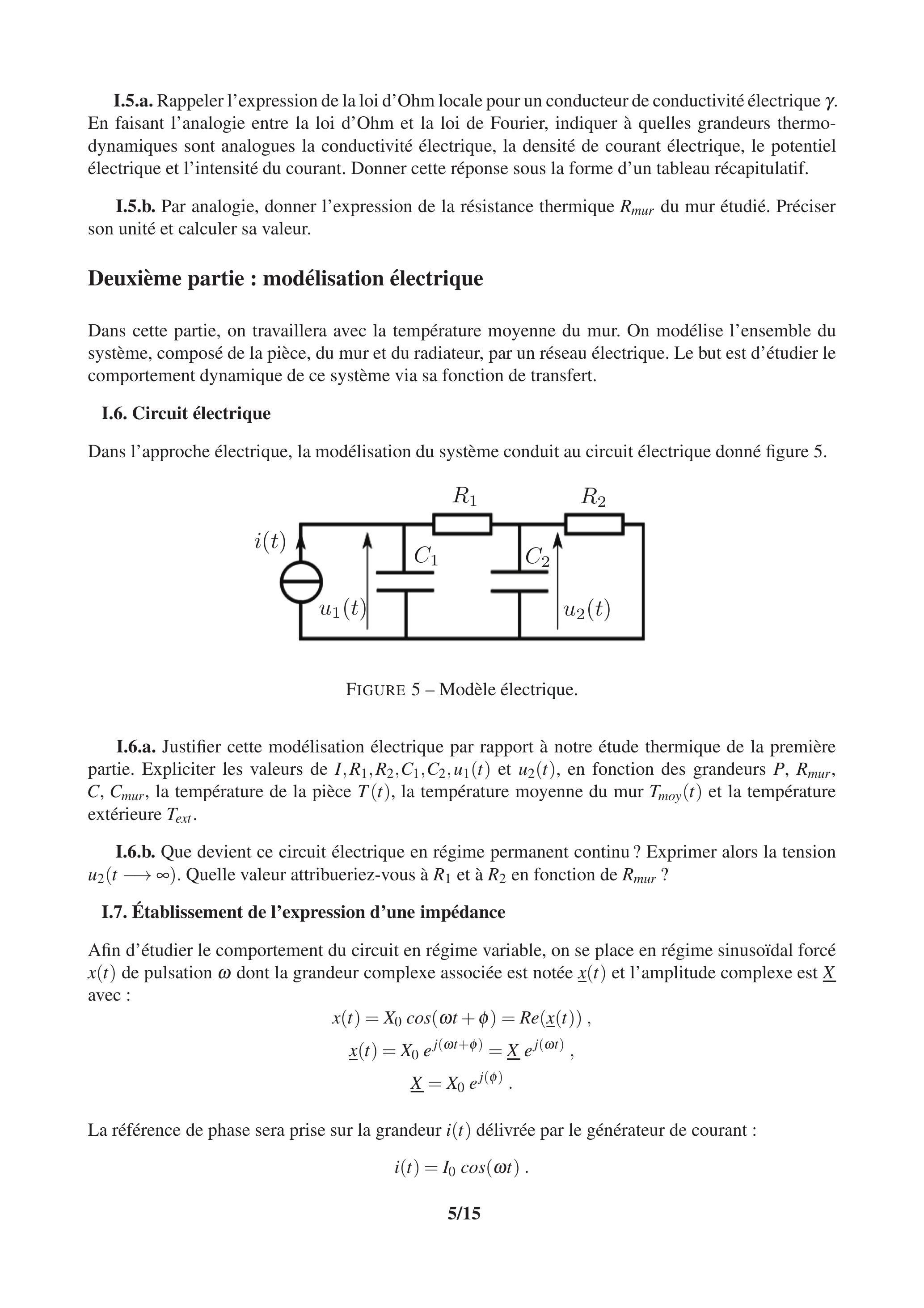 I.6.a. Justifier cette modélisation électrique par rapport à notre étude thermique de la première partie. Expliciter les valeurs de et , en fonction des grandeurs , , la température de la pièce , la température moyenne du mur et la température extérieure .