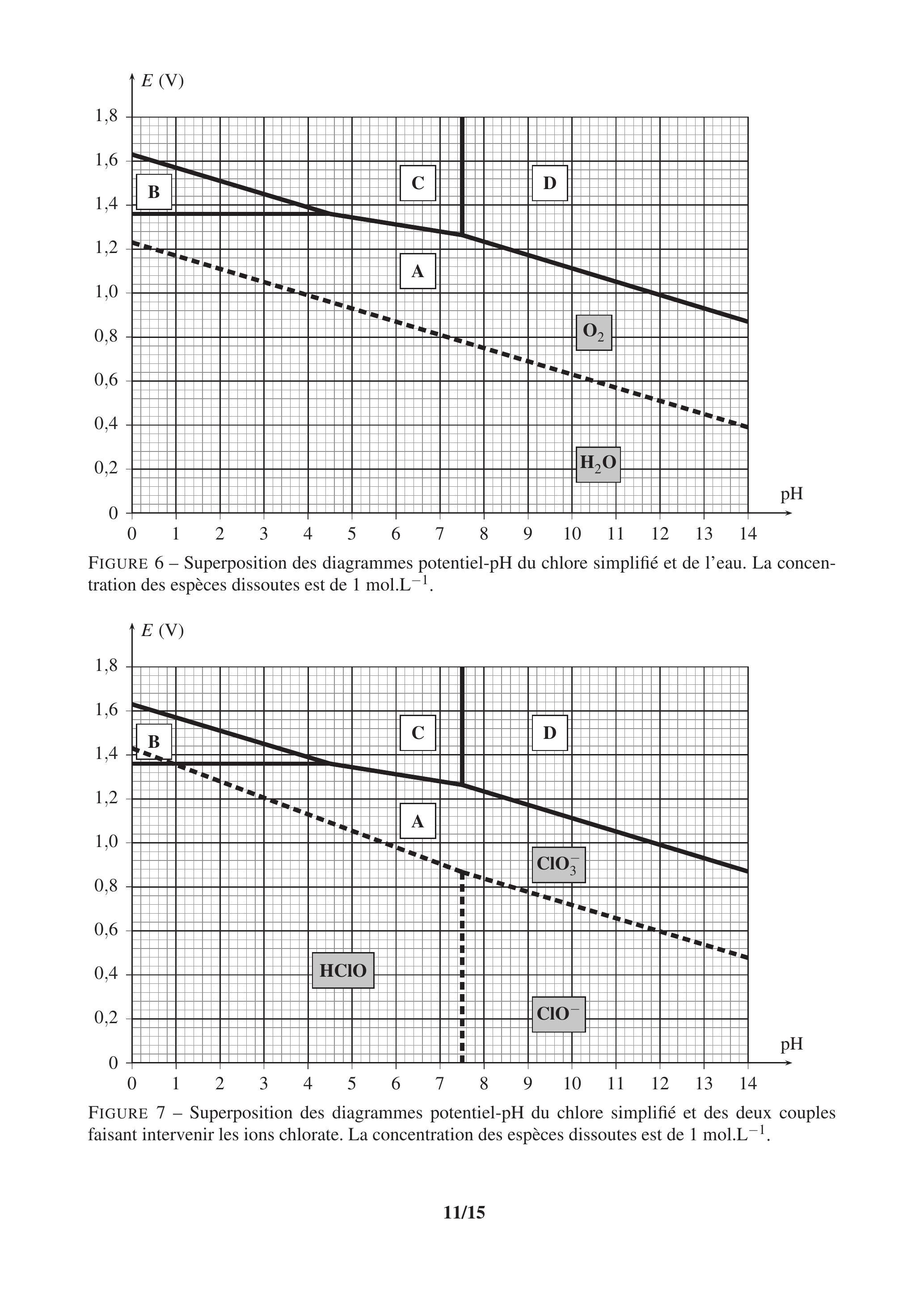 La figure 6 (page 11) est la superposition des droites relatives au couple et d'un diagramme simplifié de l'élément chlore, c'est-à-dire dans une situation chimique sans présence d'ions chlorate. Les seules espèces à envisager sont donc celles des couples du tableau 2 (page 12) pour lesquelles on indique la valeur du potentiel standard par rapport l'E.S.H. (Electrode Standard à Hydrogène).