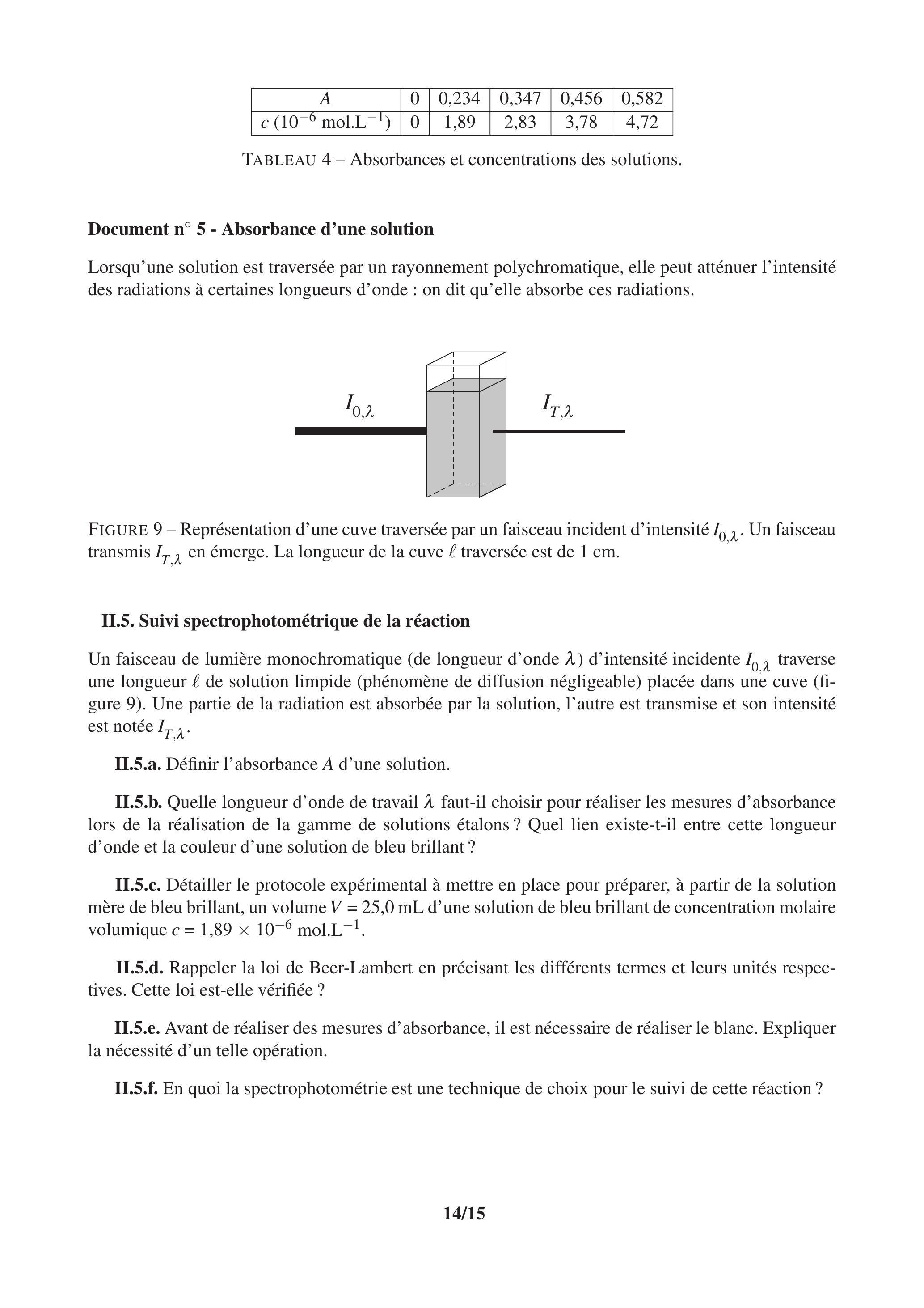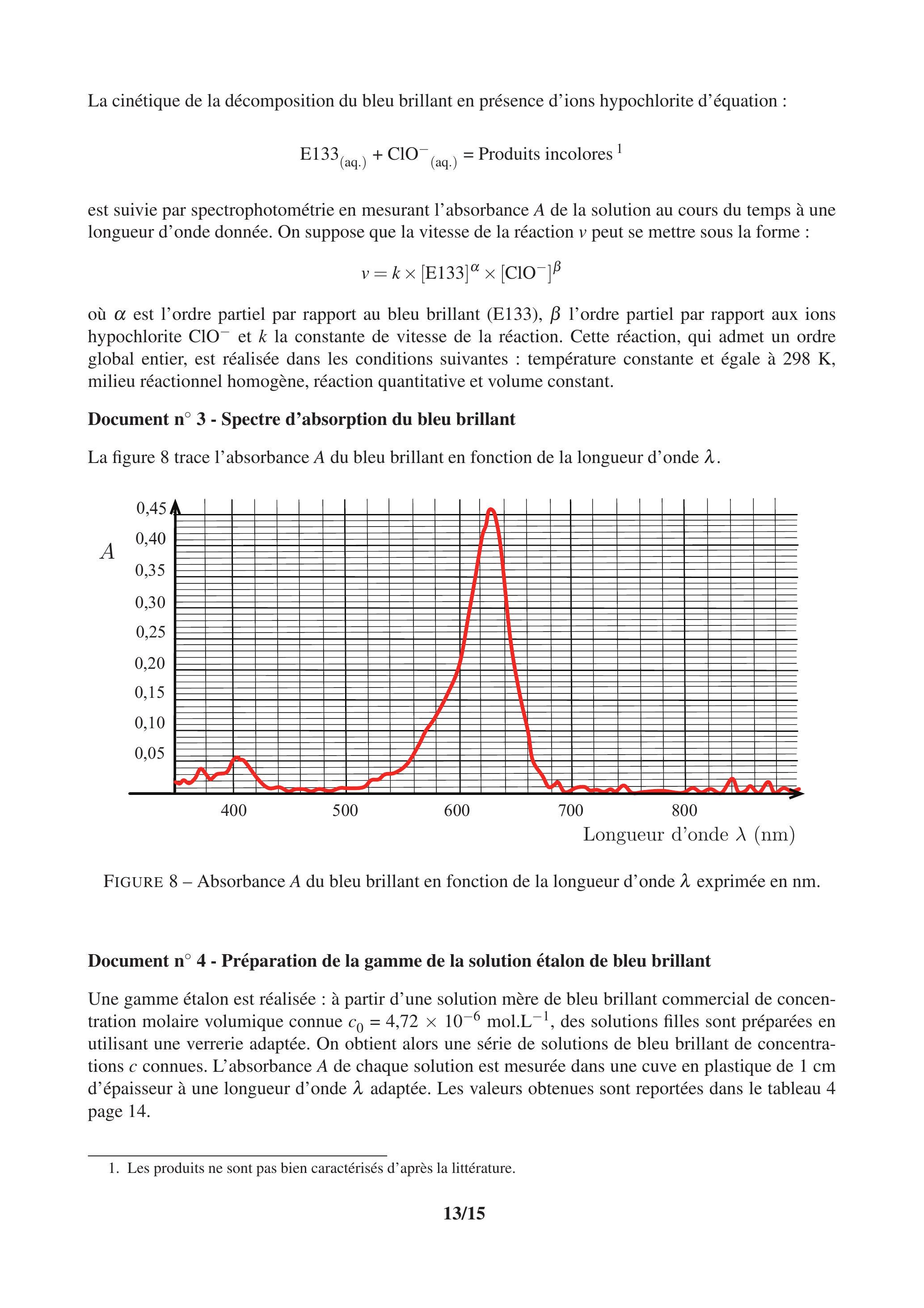 Une gamme étalon est réalisée : à partir d'une solution mère de bleu brillant commercial de concentration molaire volumique connue , des solutions filles sont préparées en utilisant une verrerie adaptée. On obtient alors une série de solutions de bleu brillant de concentrations connues. L'absorbance de chaque solution est mesurée dans une cuve en plastique de 1 cm d'épaisseur à une longueur d'onde adaptée. Les valeurs obtenues sont reportées dans le tableau 4 page 14.