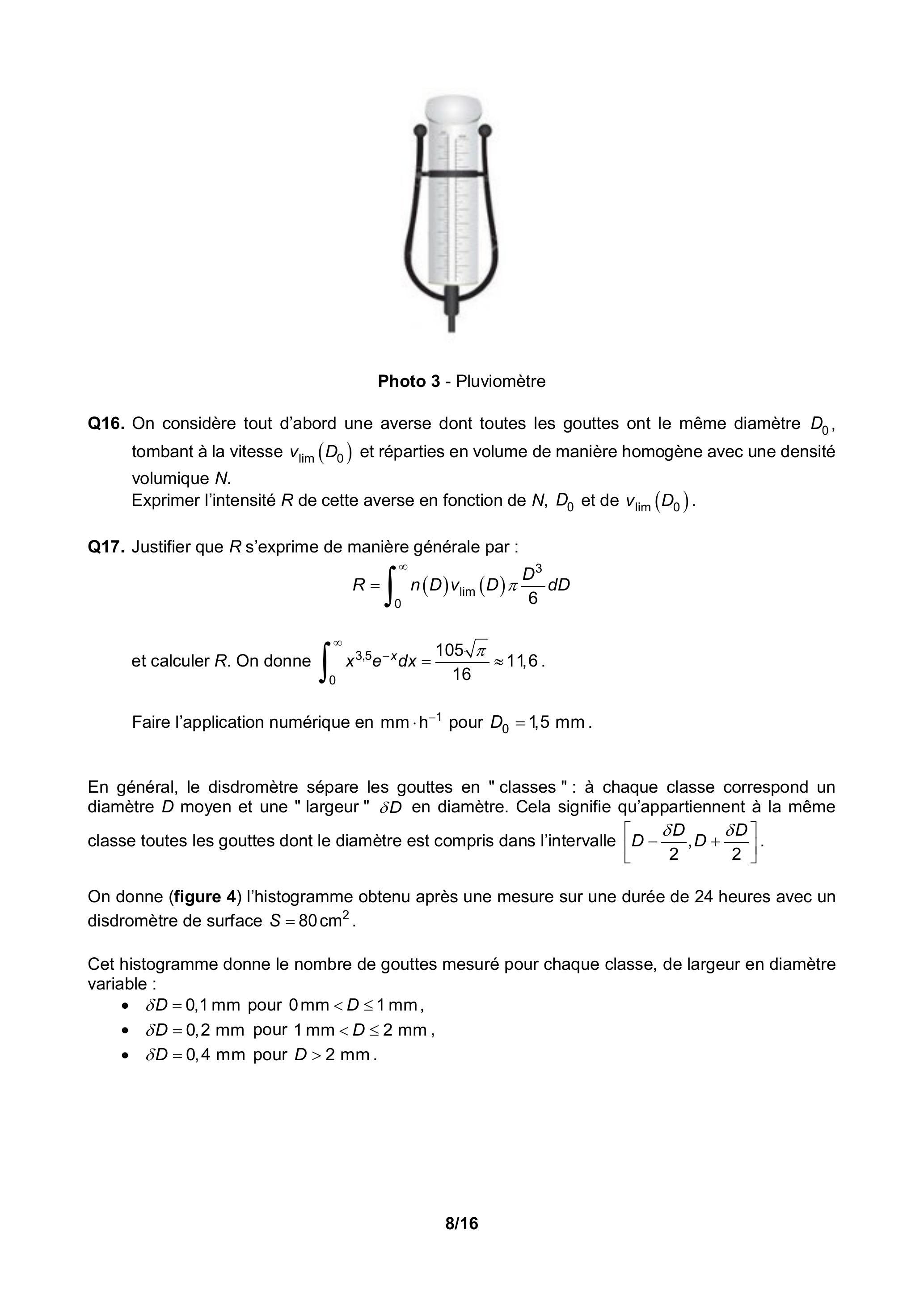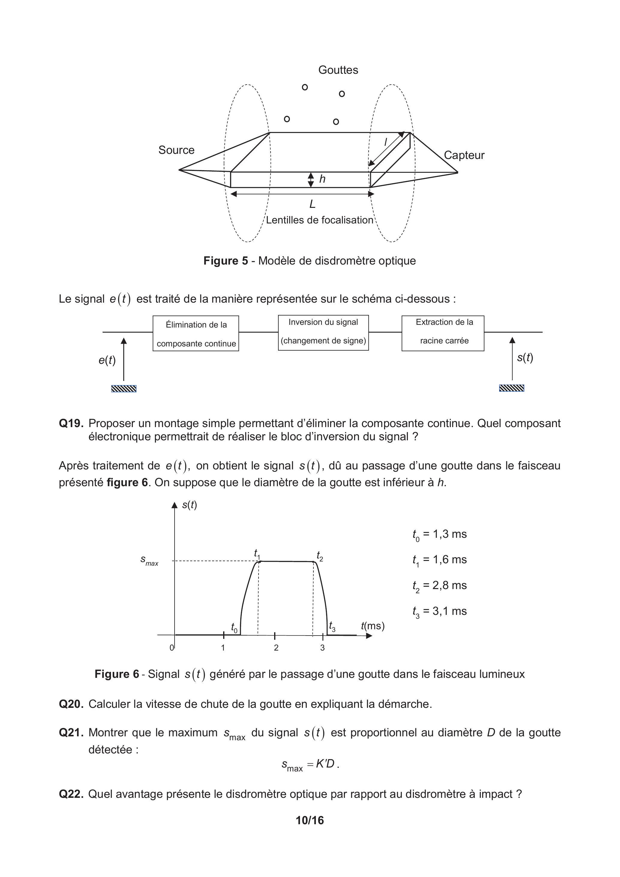 Dans les parties I et II (mécanique du point) et III (électrostatique), on s'intéresse d'abord à la vitesse limite de chute des gouttes de pluie et à la mesure de leurs diamètres, puis, dans la partie IV, à la répartition (distribution) de ces diamètres dans une averse et, dans la partie (étude d'un signal), à une autre mesure de ces diamètres.