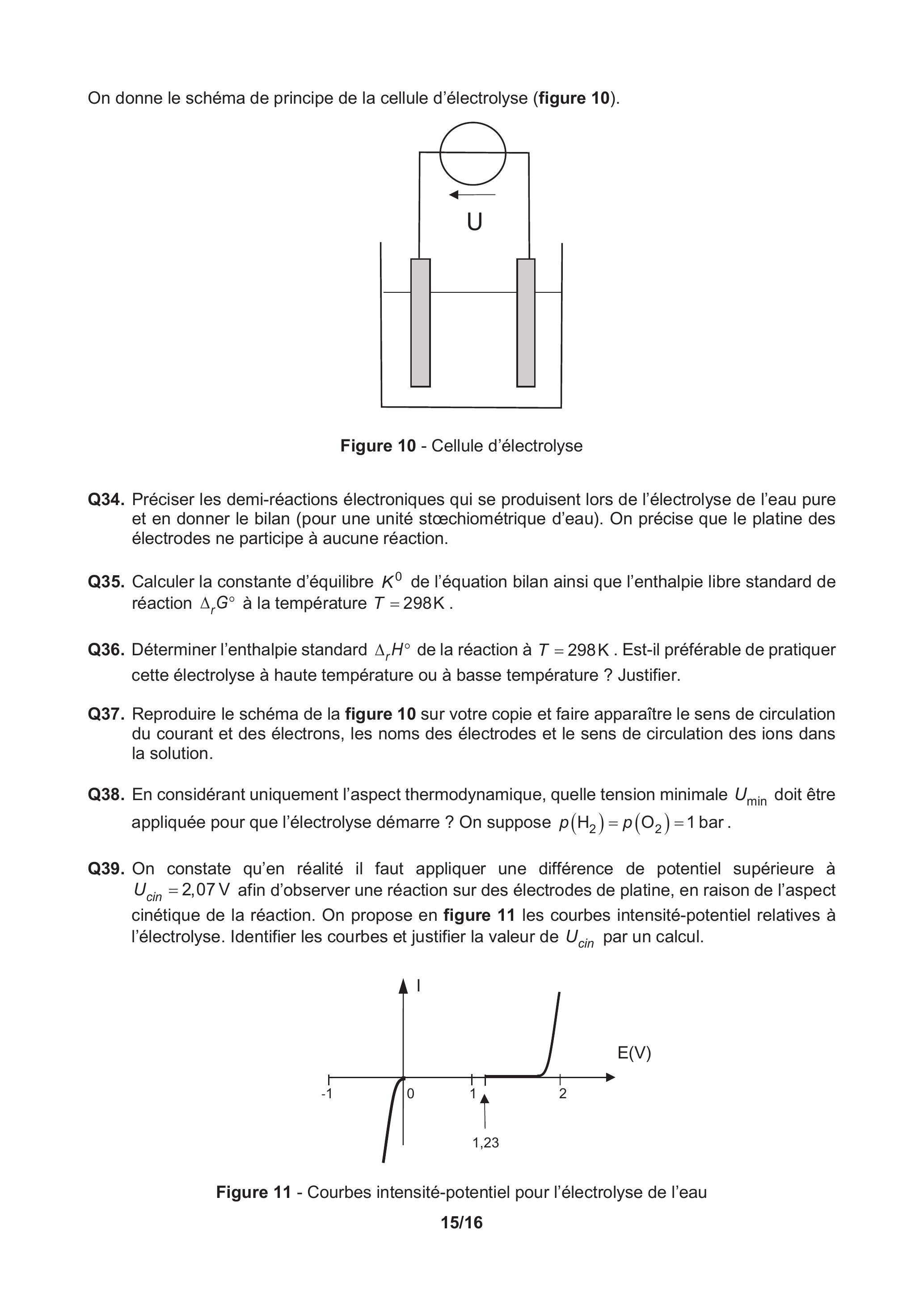 Q34. Préciser les demi-réactions électroniques qui se produisent lors de l'électrolyse de l'eau pure et en donner le bilan (pour une unité stœchiométrique d'eau). On précise que le platine des électrodes ne participe à aucune réaction.