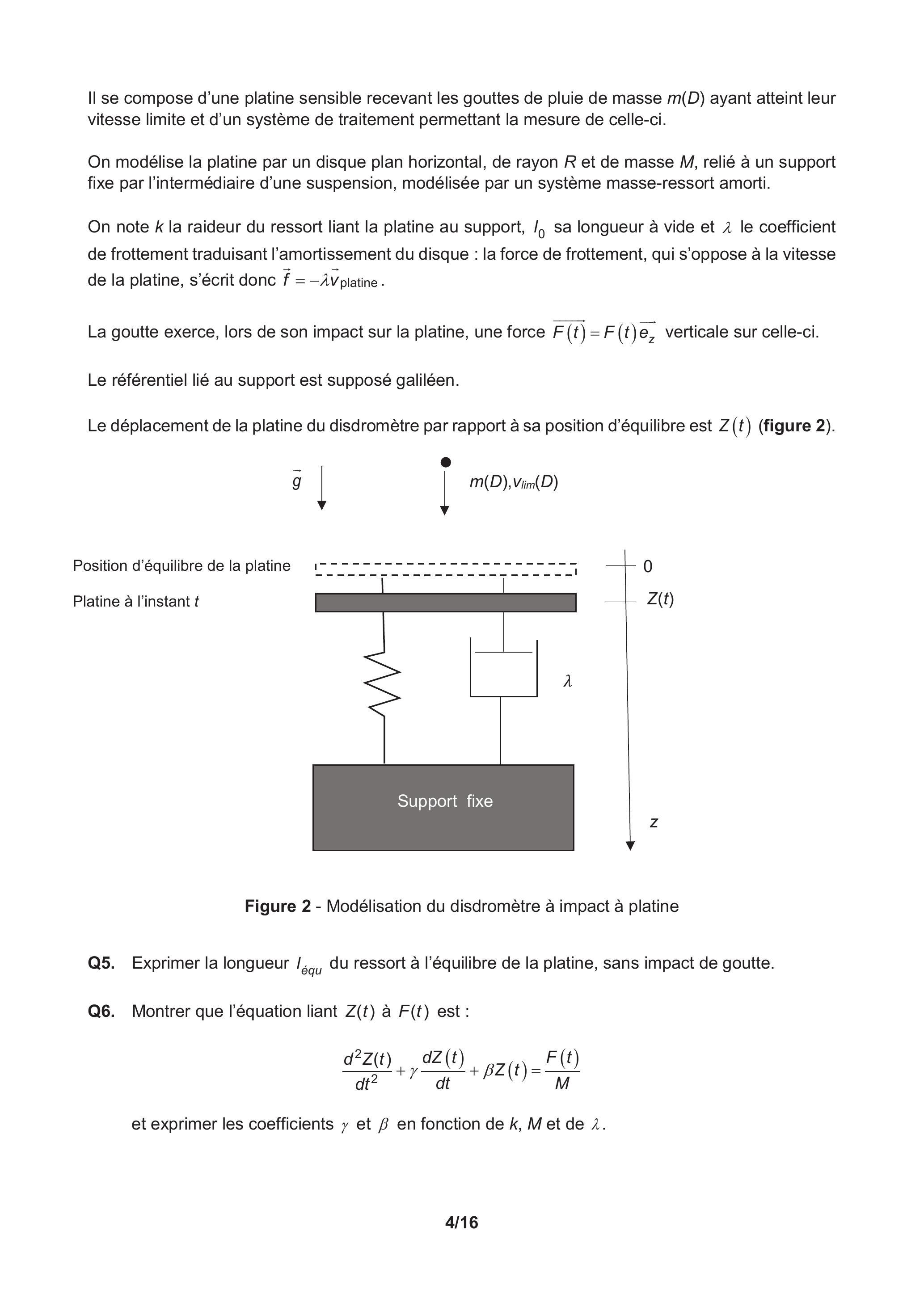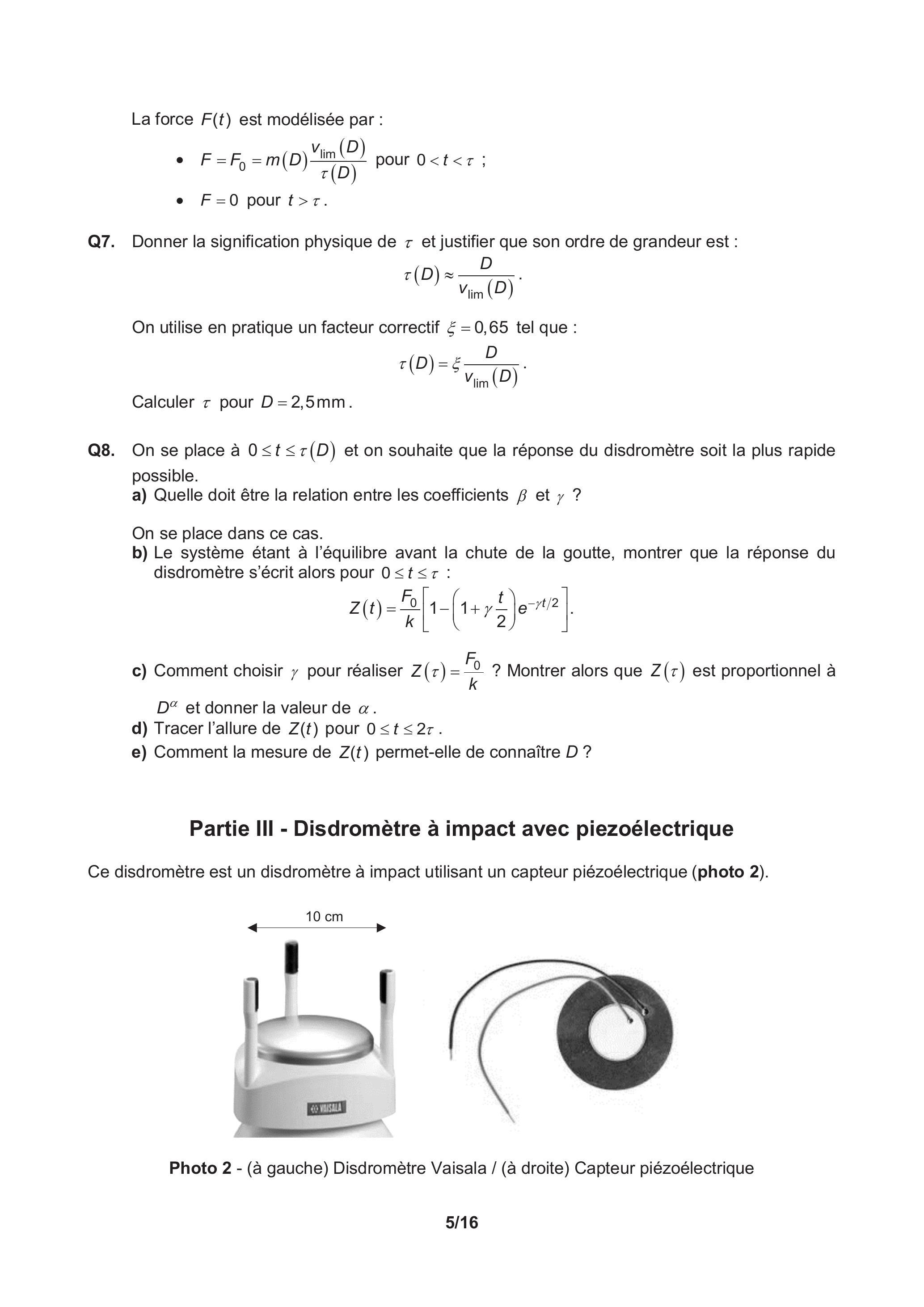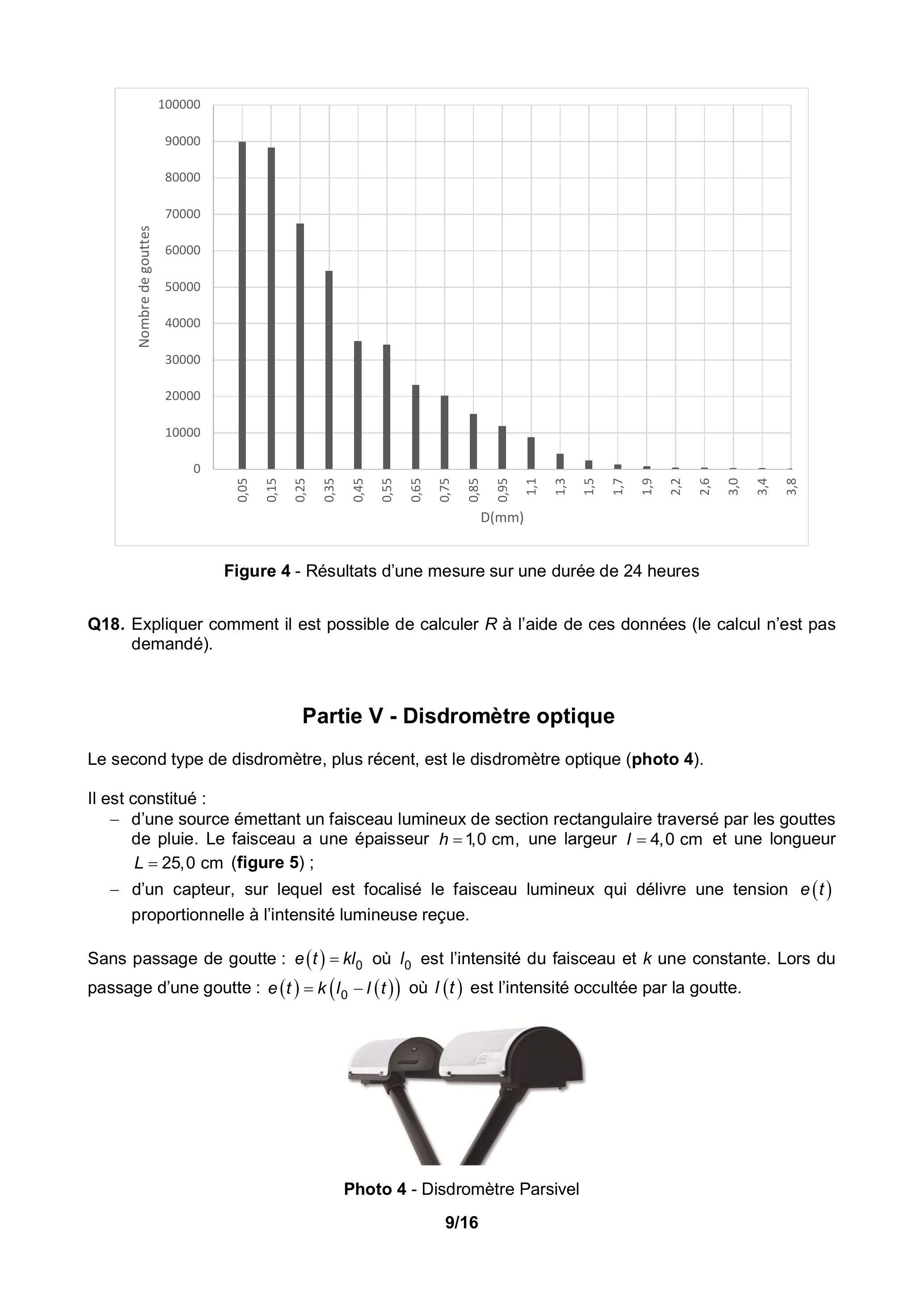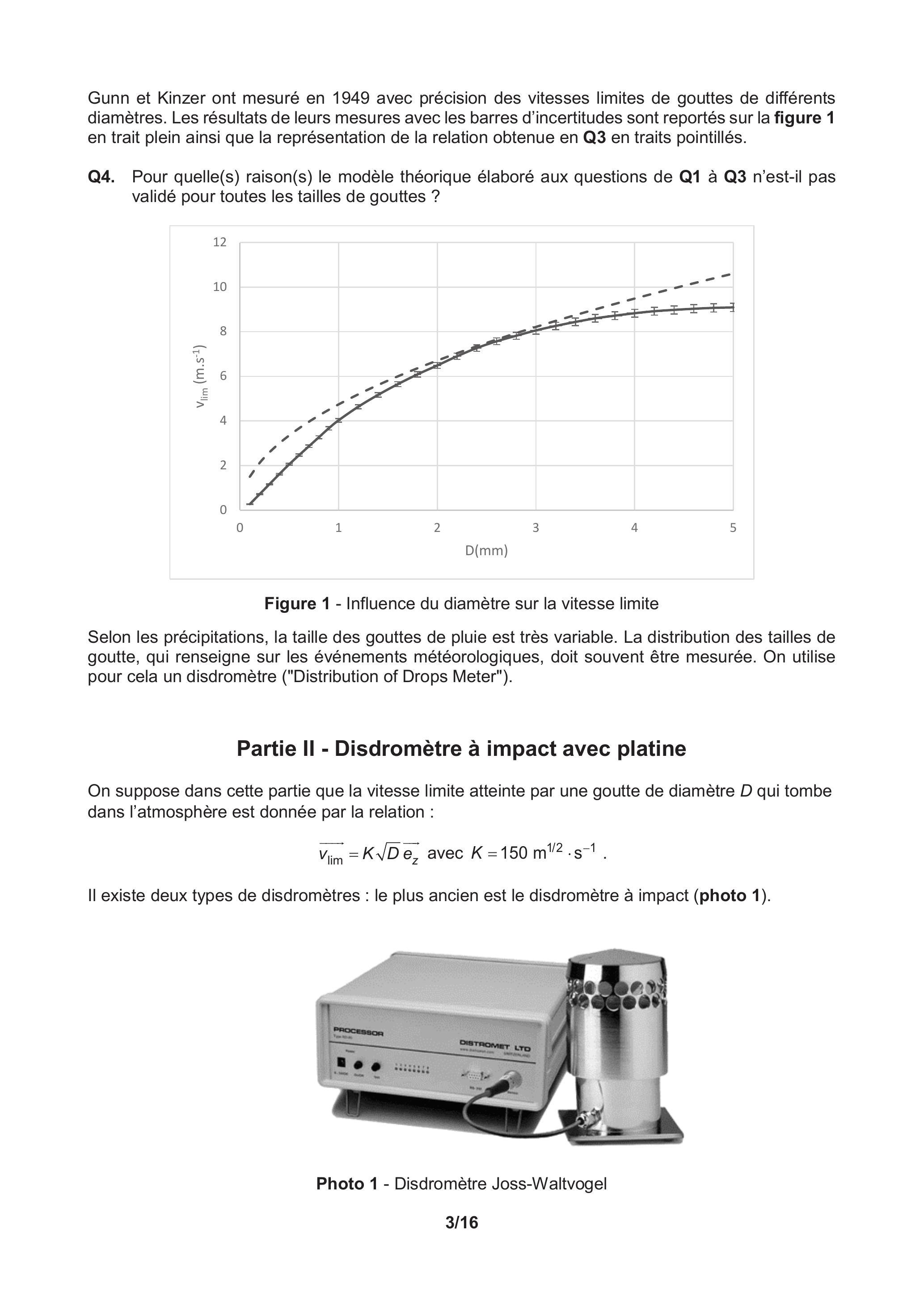 Dans les parties I et II (mécanique du point) et III (électrostatique), on s'intéresse d'abord à la vitesse limite de chute des gouttes de pluie et à la mesure de leurs diamètres, puis, dans la partie IV, à la répartition (distribution) de ces diamètres dans une averse et, dans la partie (étude d'un signal), à une autre mesure de ces diamètres.