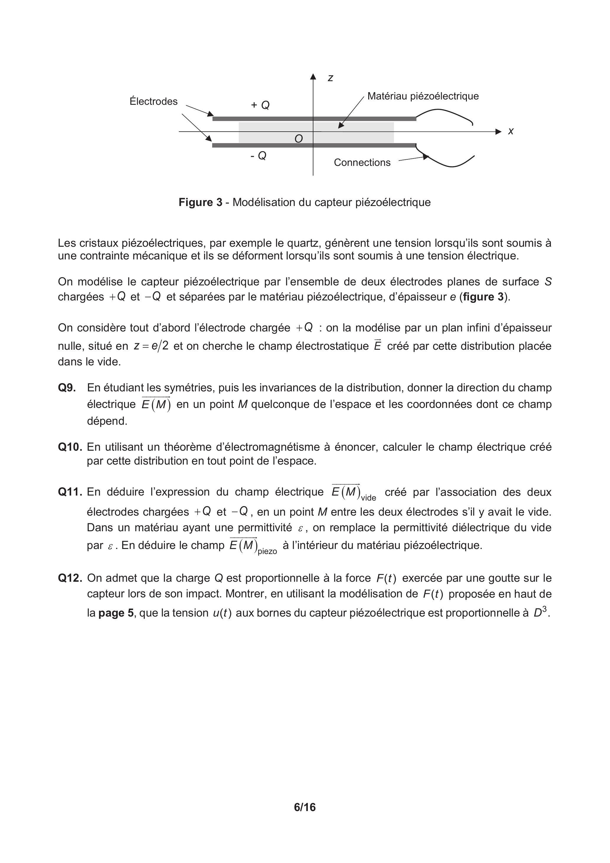 Q12. On admet que la charge est proportionnelle à la force exercée par une goutte sur le capteur lors de son impact. Montrer, en utilisant la modélisation de proposée en haut de la page 5 , que la tension aux bornes du capteur piézoélectrique est proportionnelle à .