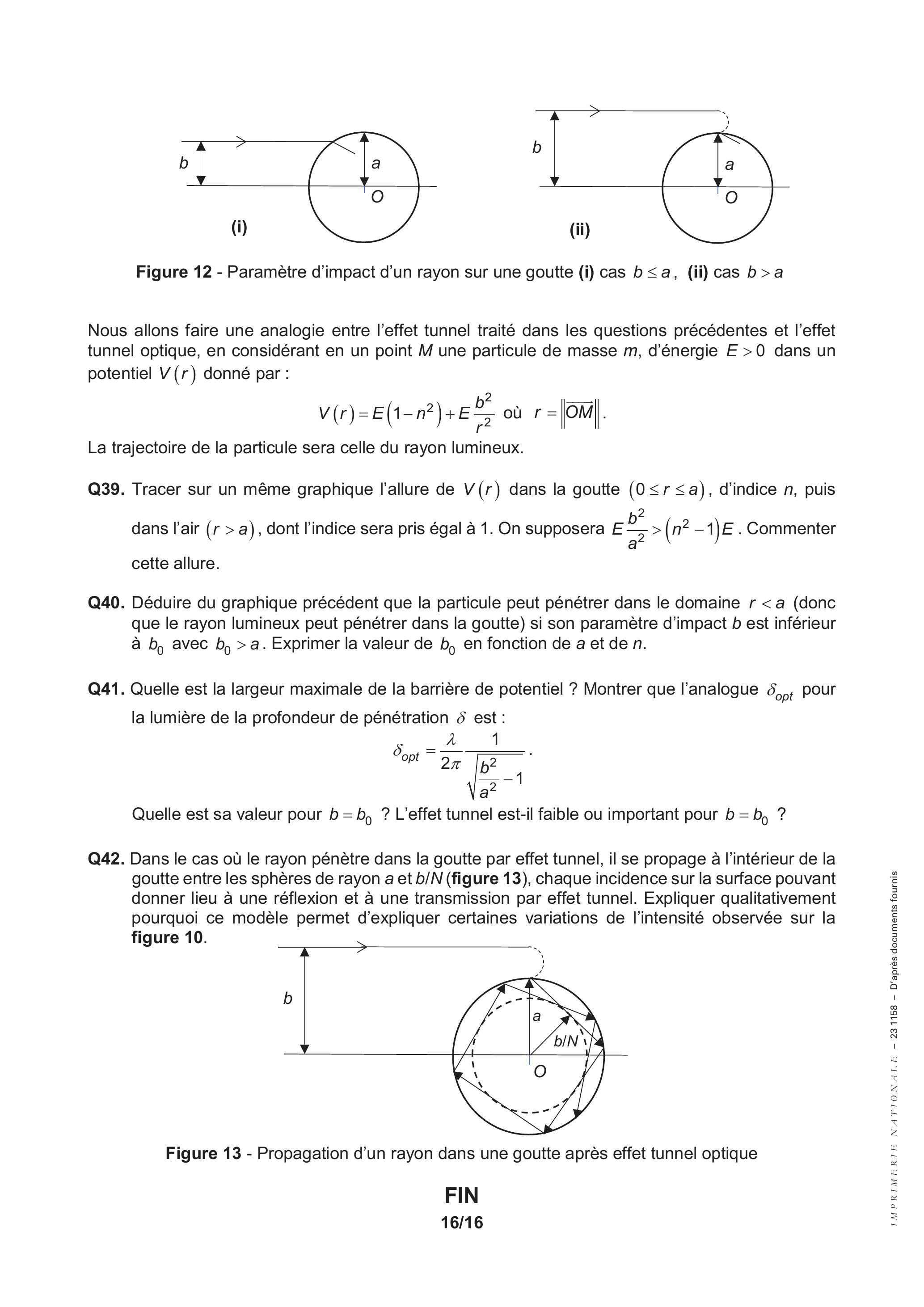Q42. Dans le cas où le rayon pénètre dans la goutte par effet tunnel, il se propage à l'intérieur de la goutte entre les sphères de rayon a et (figure 13), chaque incidence sur la surface pouvant donner lieu à une réflexion et à une transmission par effet tunnel. Expliquer qualitativement pourquoi ce modèle permet d'expliquer certaines variations de l'intensité observée sur la figure 10.