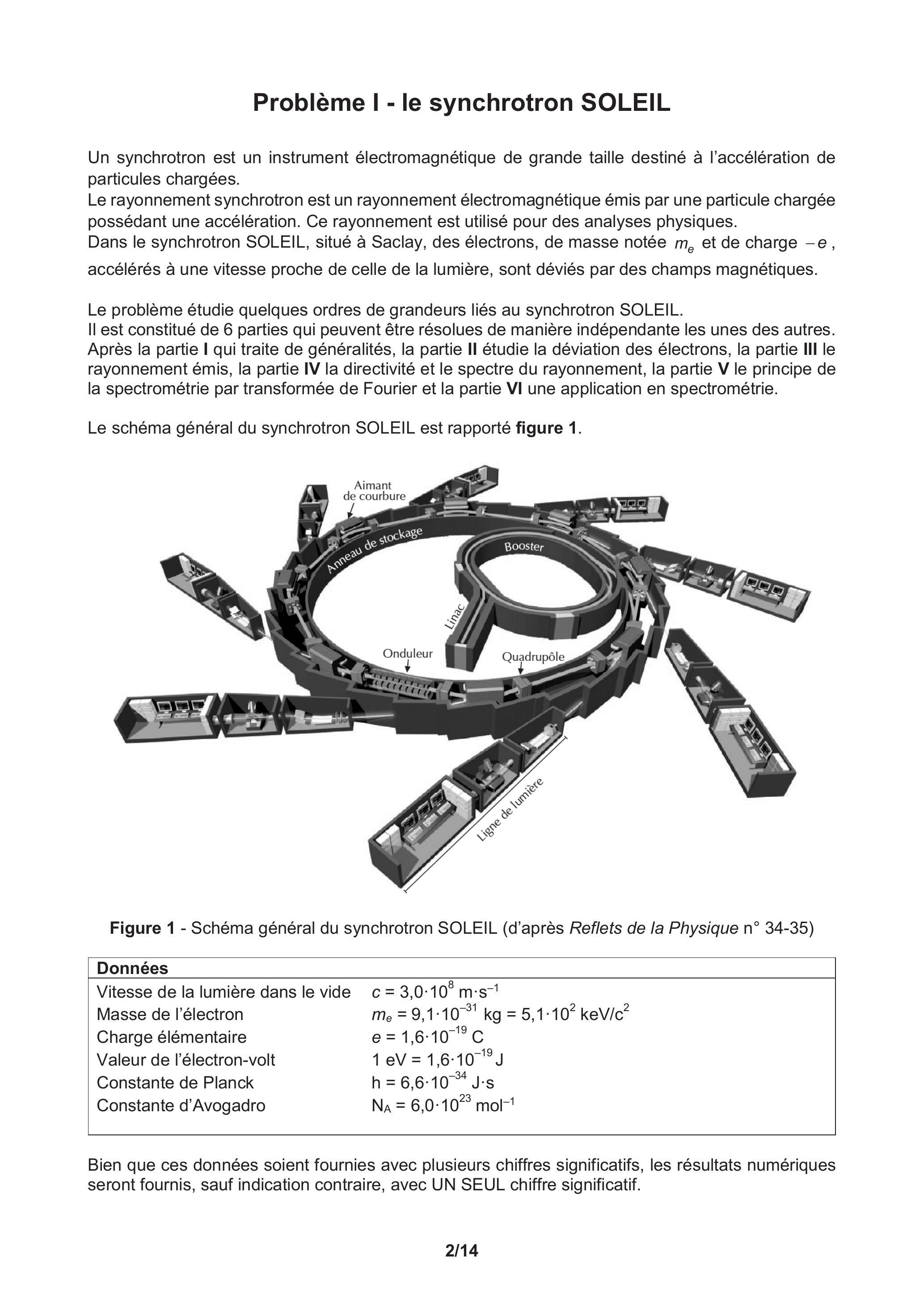 Le problème étudie quelques ordres de grandeurs liés au synchrotron SOLEIL.